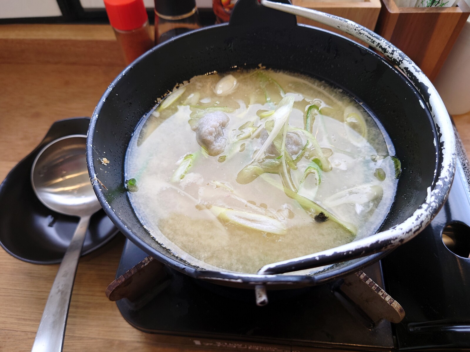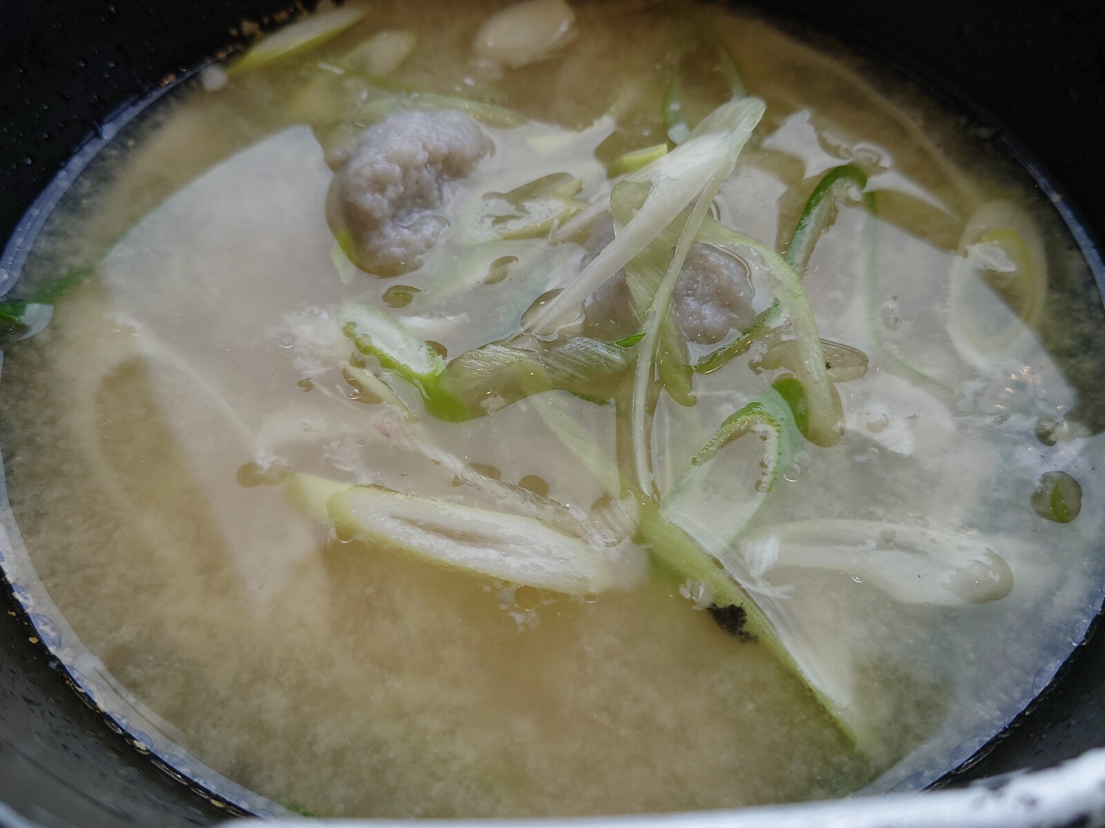 火にかけたばかりの漁師汁。中には、魚のすり身が入っているよ。ざく切りのねぎが、いい味出しているのだ。