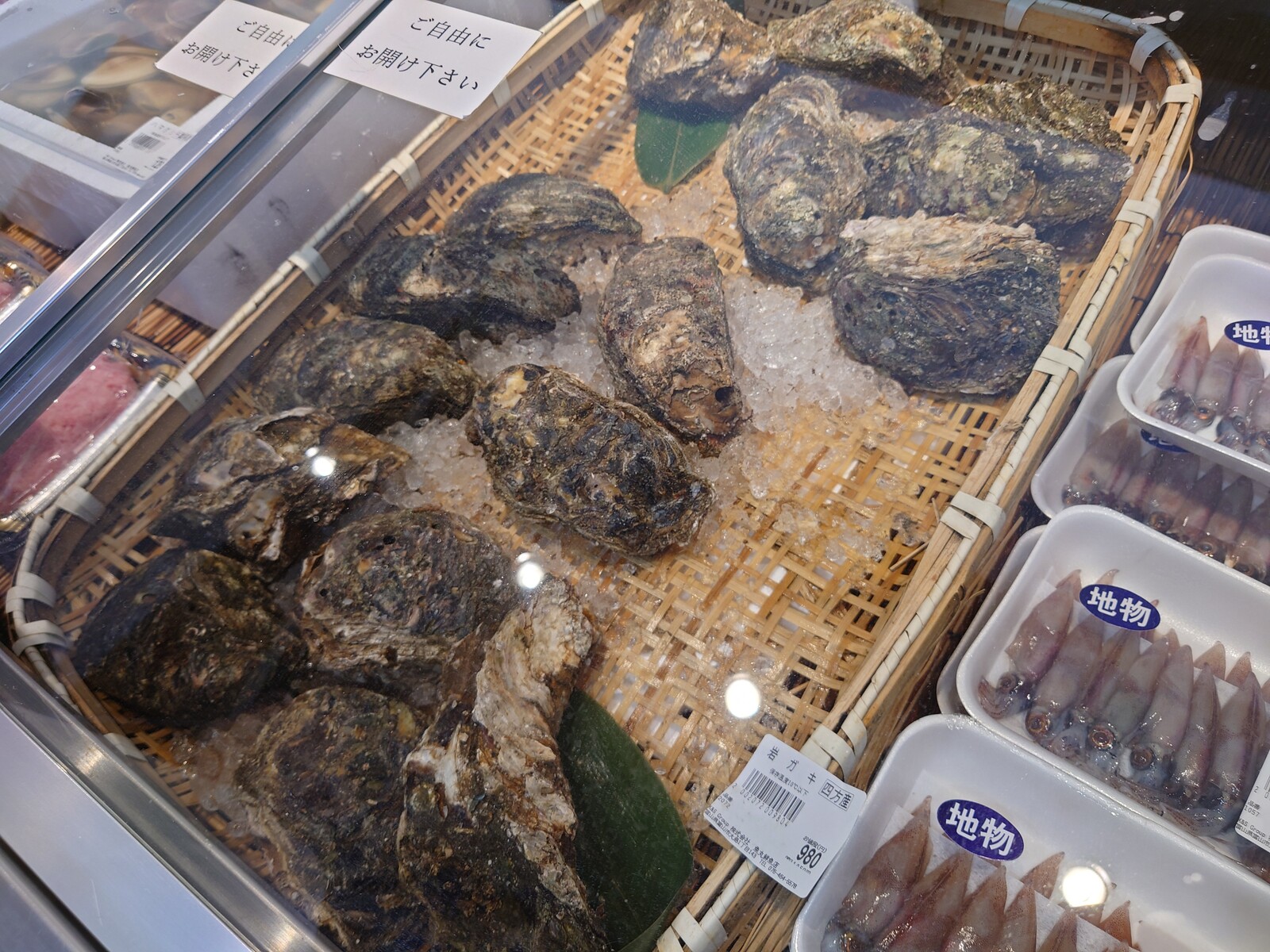 魚屋さんのスペースには、四方でとれた岩ガキが並んでいたよ。これを食堂でいただくこともできるんだって。