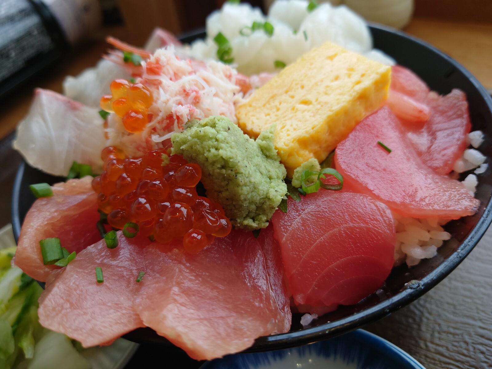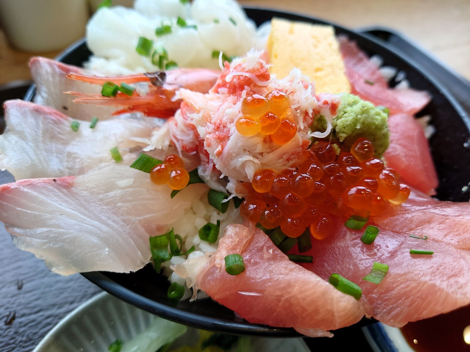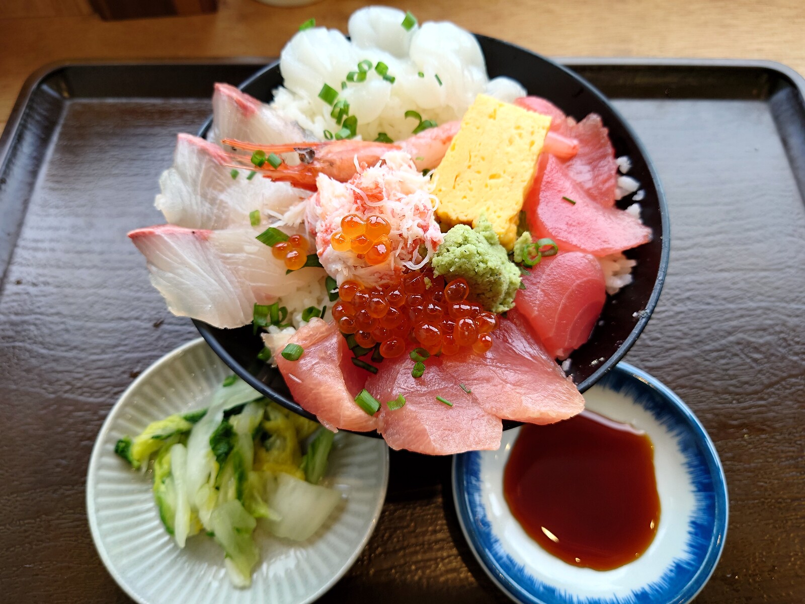 甘エビとカニをてっぺんに、赤身、白身とバランスよく盛られた海鮮丼は、見事の一言に尽きるのだ。