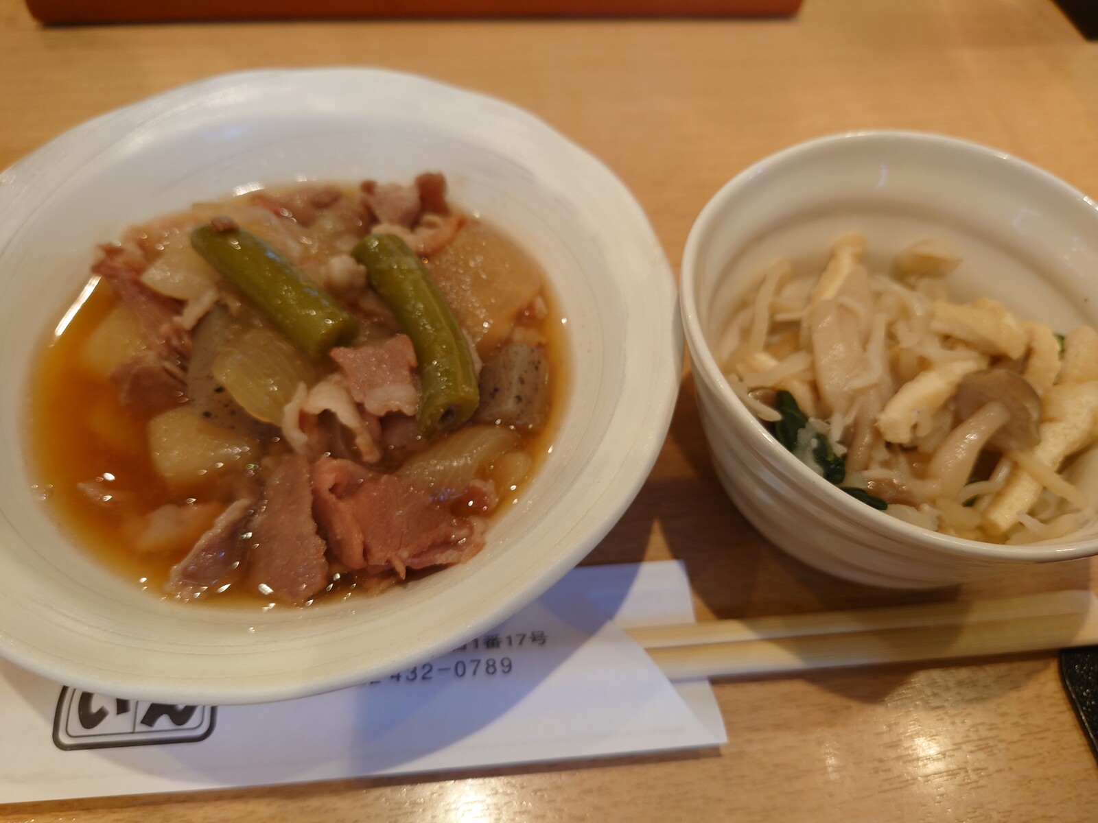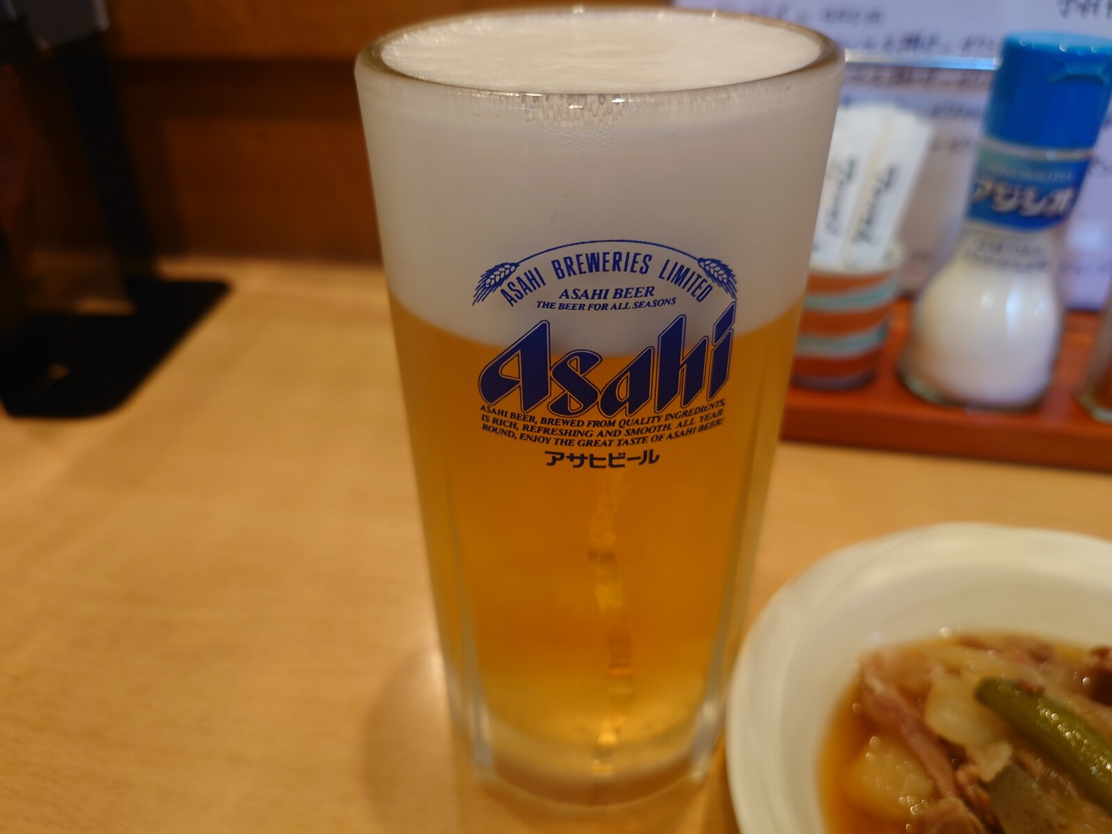 『肉じゃが』と『きのこの煮びたし』がお通しで登場。これが、1皿100円ほどでいただけるのだから、この店は神、としかいいようがないのだ。