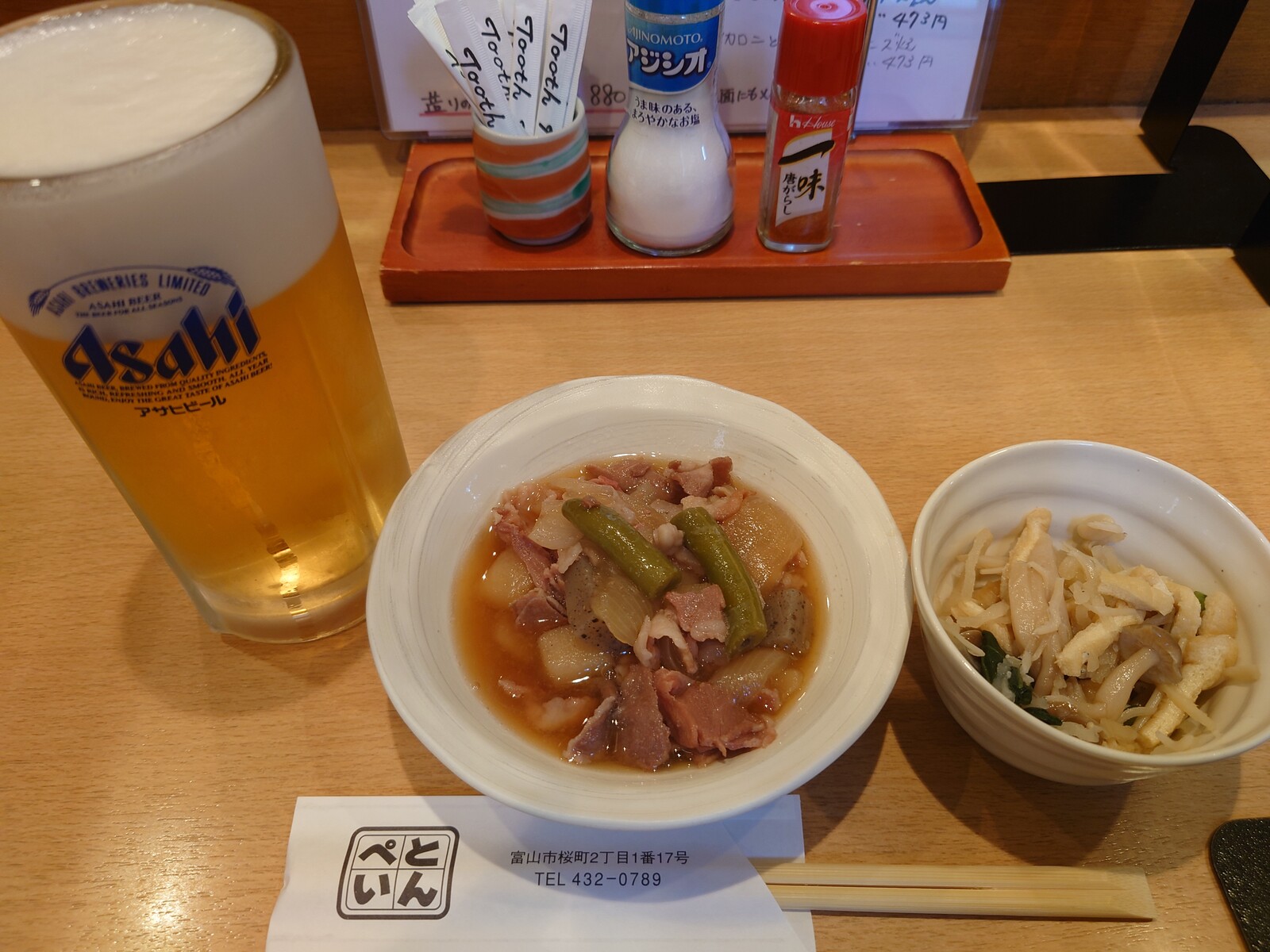 時には、昔ながらの居酒屋を訪ねてみたいではないか。訪れたのは「とんぺい」。富山駅前にずーっと昔からある、富山に住むなら一度は訪れたい、老舗の居酒屋さんだよ。この店の売りは、なんといってもお値段リーズナブルなこと。この日も、1000円とちょっとで心地よくなれたのだ。
