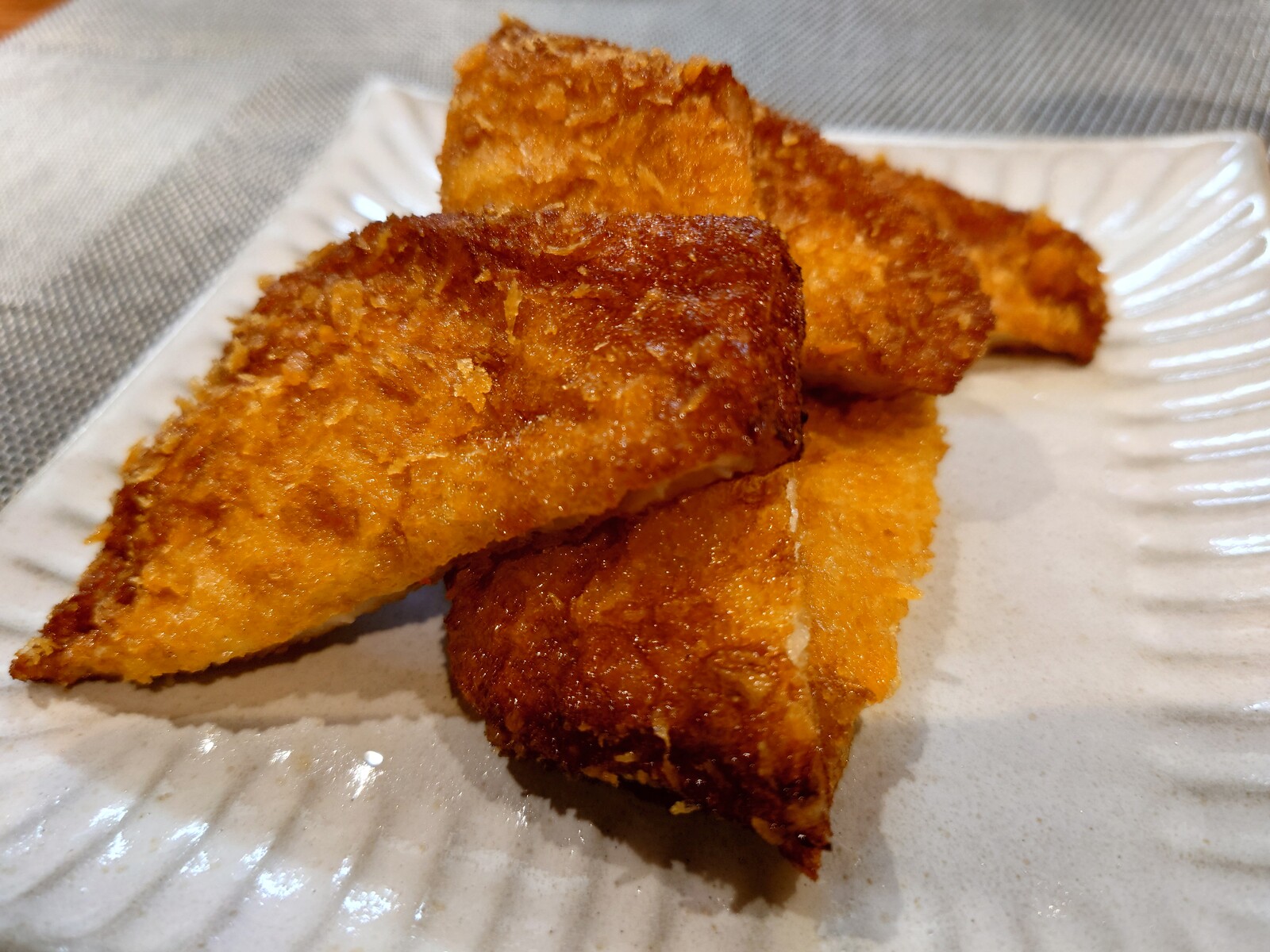 かくして登場したのがこちら。すり身に玉ねぎ、一味唐辛子を入れ、薄く伸ばしてパン粉を付けて揚げた、すり身カツといった一品だったよ。けっこう歯ごたえがあって、ピリッとした辛みがちょっとだけ感じられる素晴らしき逸品に、すっかり感激したんだ。確かに、さつまあげとはかなり違ってる〜。