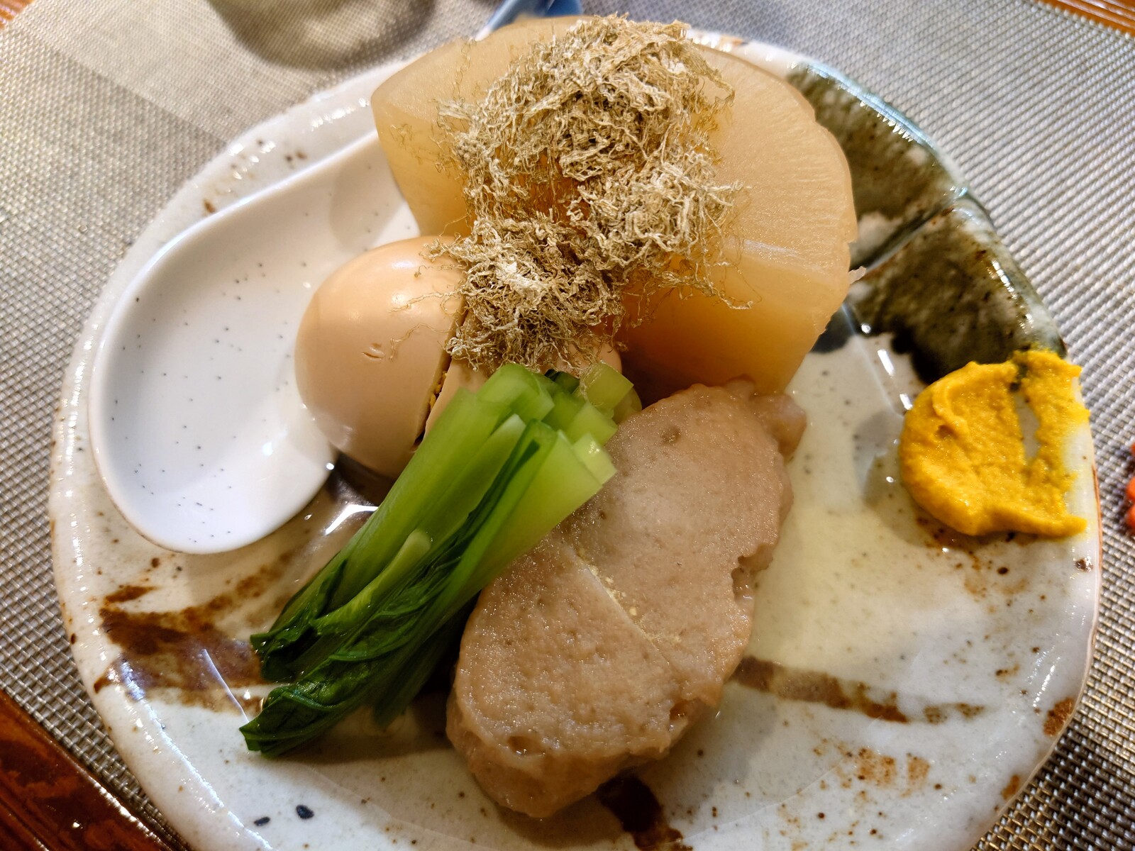 そして、『富山おでん』も頼んでみたよ。『大根』『すり身』『たまご』の3品は、薄味がよくしみた逸品。夏でも、熱々のおでんが、冷えたビールにはぴったりなのだ。