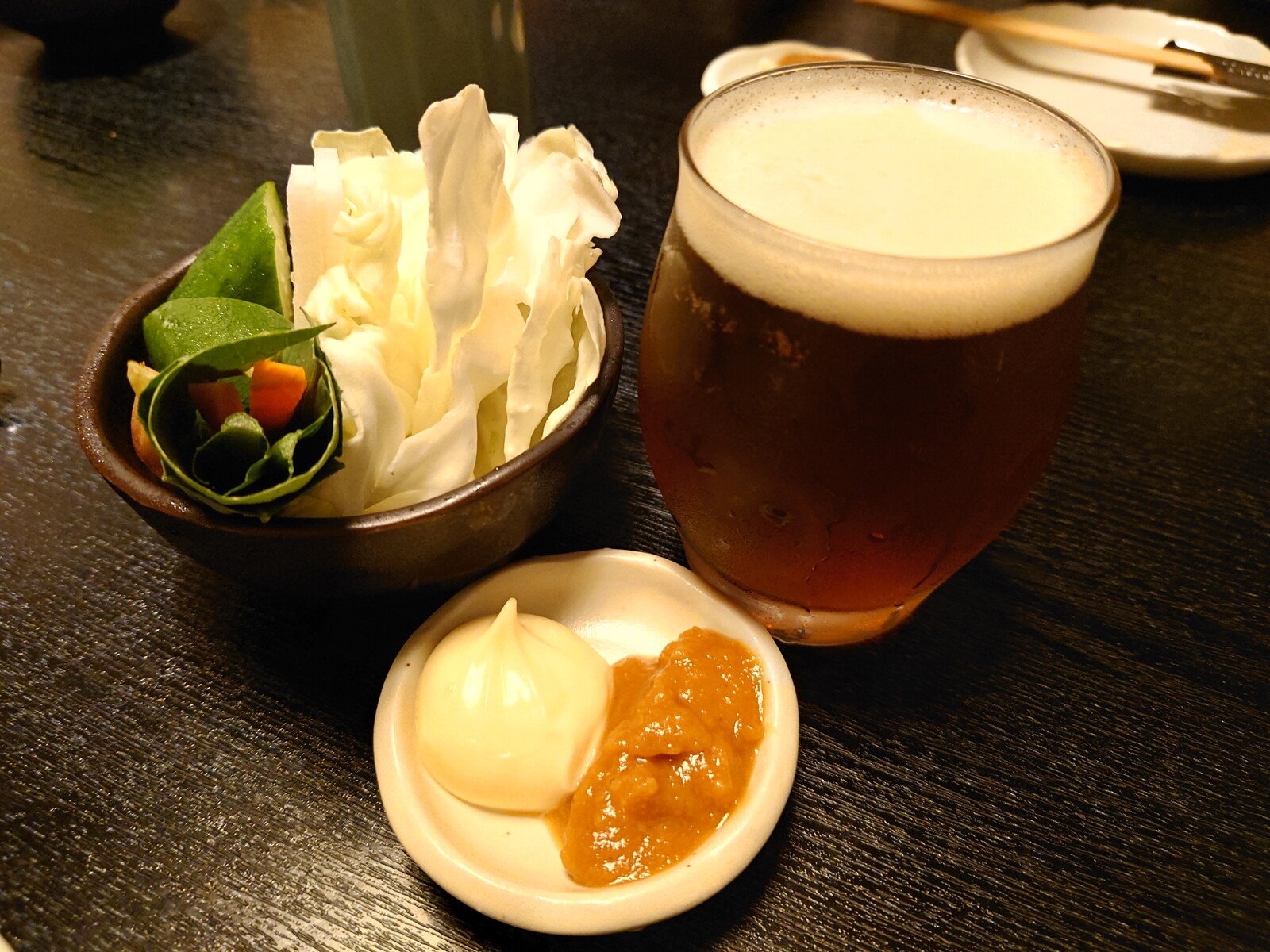 まずは、クラフトビール『SPRING VALLEY豊潤496』。キリンのクラフトビールだけど、それが生でいただけるとは、なんともうれしいお話。お通しがざく切りキャベツ、というのも串焼き屋さんらしくていいよね。