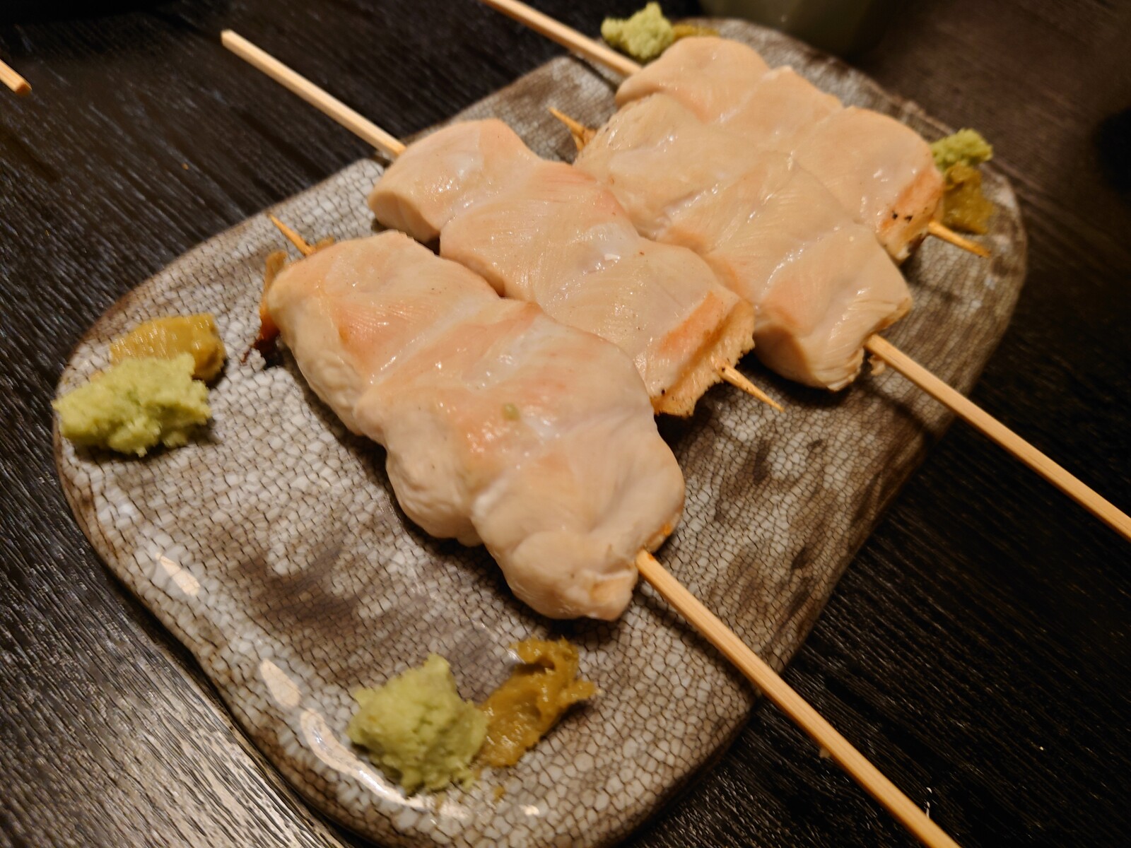 あっさり塩焼きされた『ささみ』には、柚子胡椒とわさびが添えられてて、味変を楽しむことができるのだ。