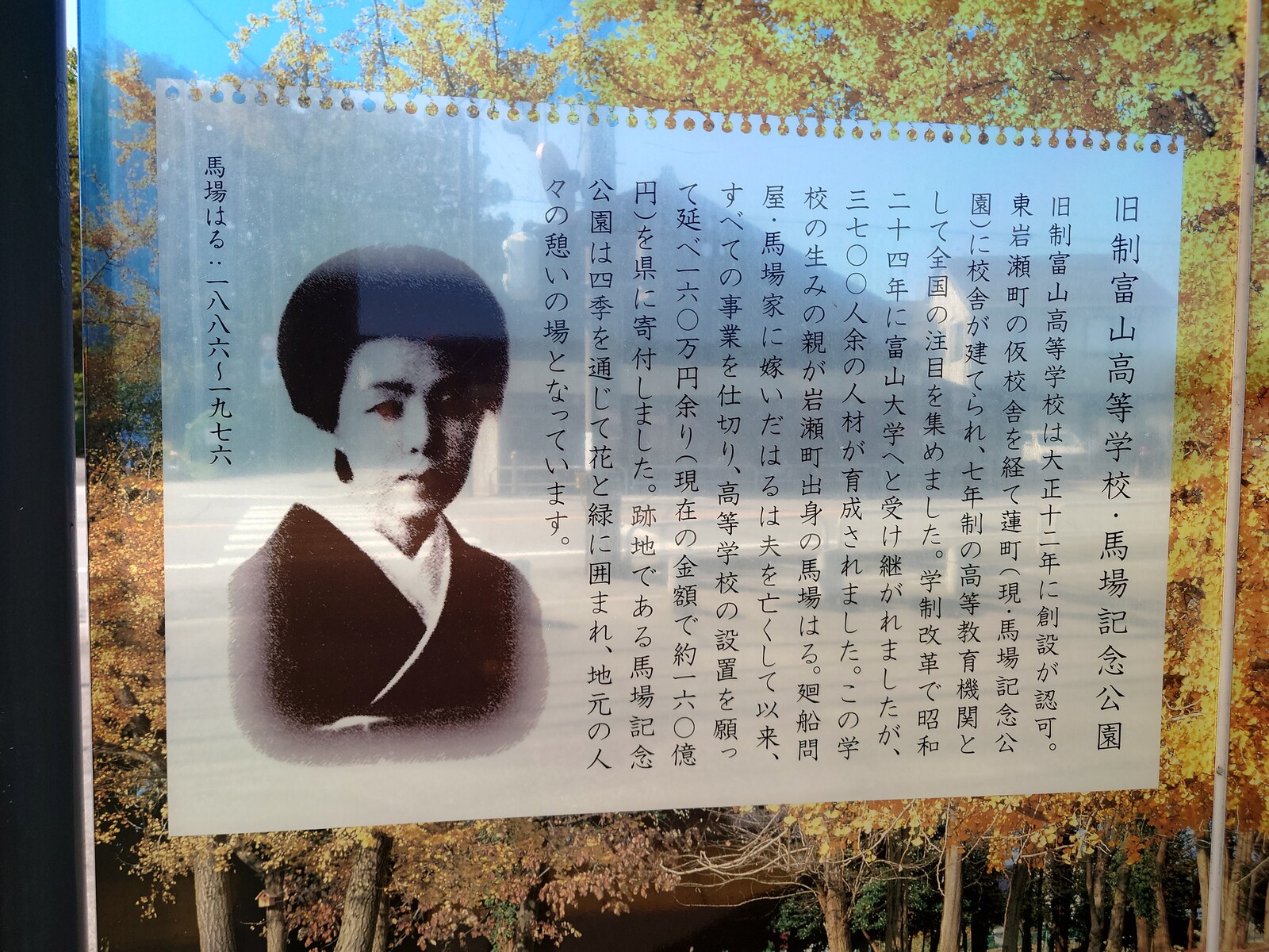 馬場記念公園の場所には、かつて旧制富山高等学校の校舎が立てられていたんだ。そして、その設置のための資金を提供したのが、廻船問屋馬場家の当主、馬場はるさん。現在の金額にして約160億円もの資金を富山県に寄付した、っていうから、いかにも太っ腹なお話。