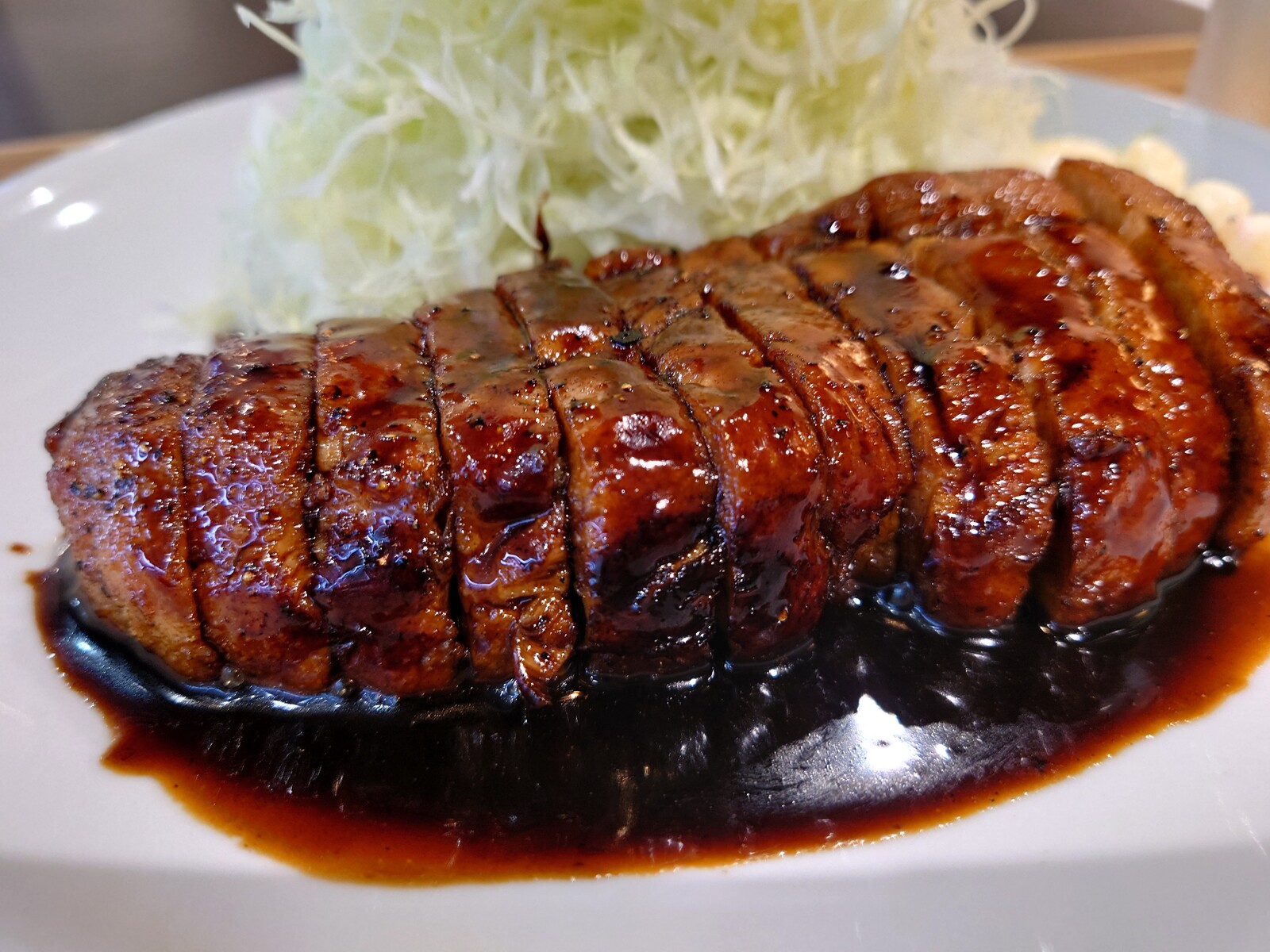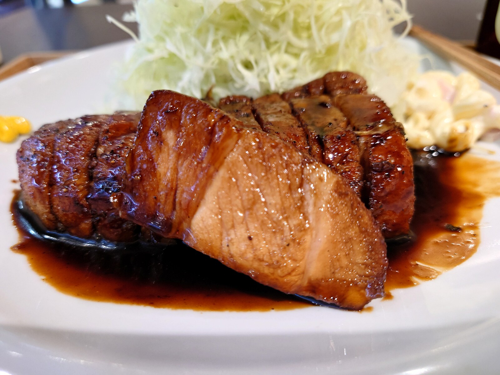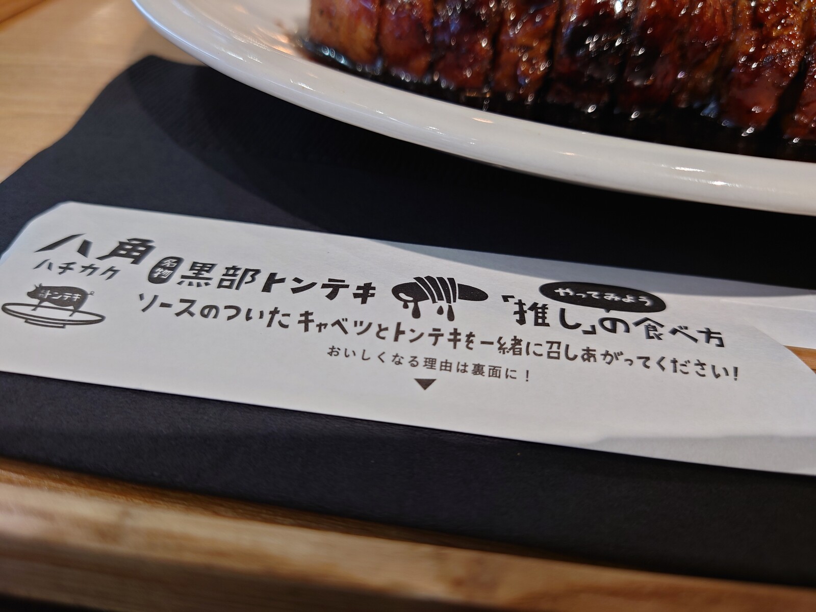 黒くて味わい濃厚なたれが、またいいんだよね。割りばしの袋には、食べ方が指南してあったから、従ってみたよ。ソースをひたしたキャベツとトンテキを一緒に食べるといいんだって書いてあったんだ。たしかに、キャベツがどんどん進んでいい感じ。