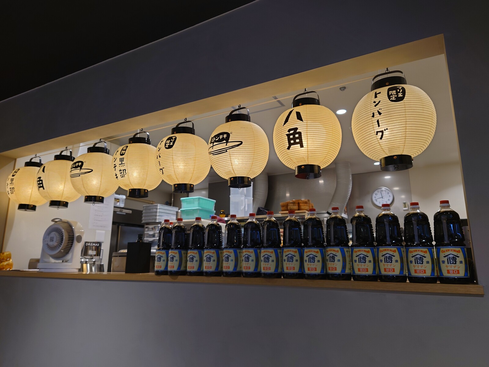 調理場横のカウンターに並んでいる醤油が、この店のたれの決め手だね。『山傳ヤマデン』の甘口醤油は、黒部市生地にある飯沢醤油味噌店の地醤油だよ。
