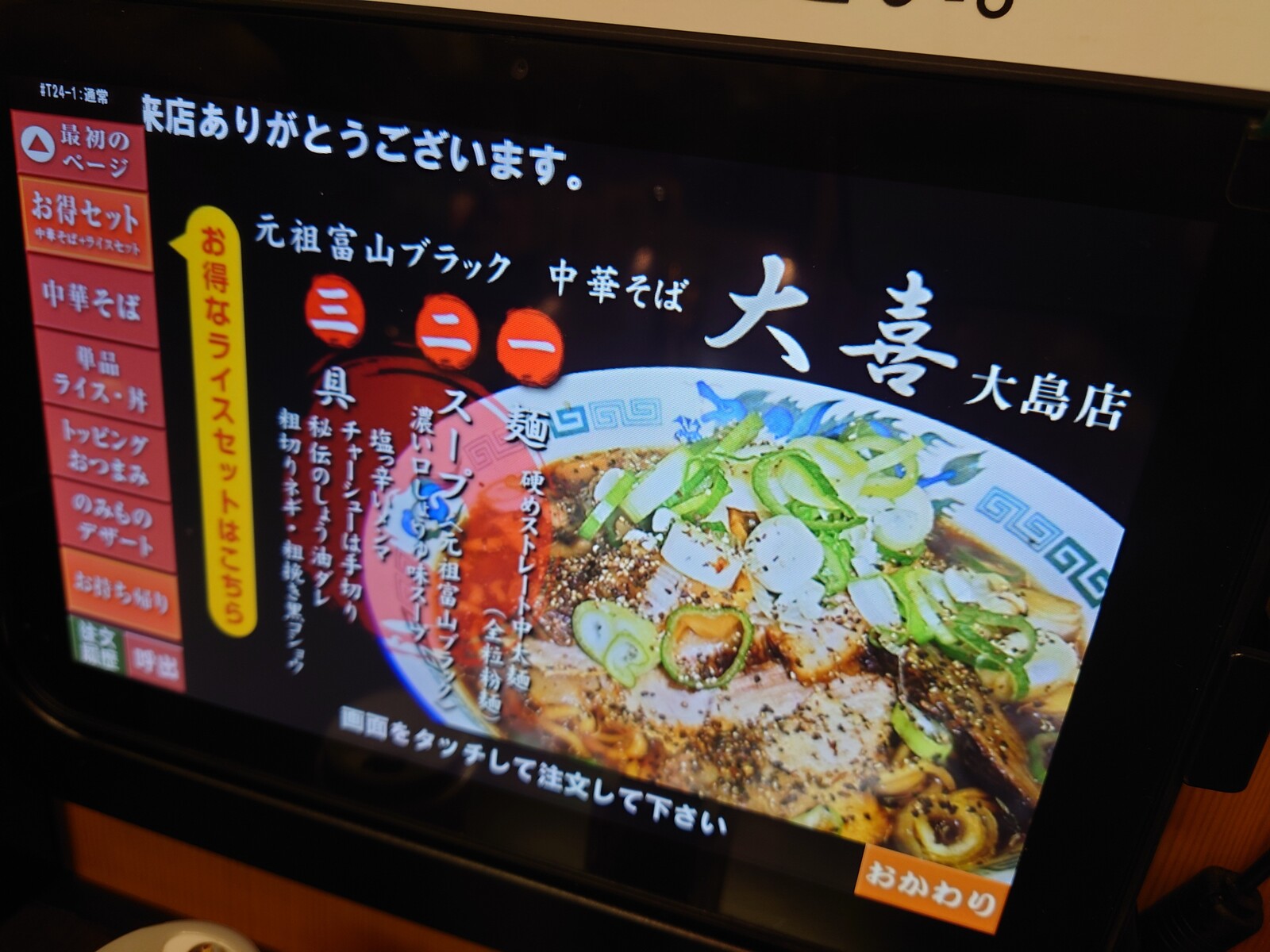 近頃、テーブルにタブレットを置いてる飲食店が増えているよね。焼肉屋さんとか蕎麦屋さんとか寿司屋さんとか・・・。この日訪れたお店も、タブレットで注文するようになってたんだよね。それは、ラーメン専門店「大喜大島店」。
