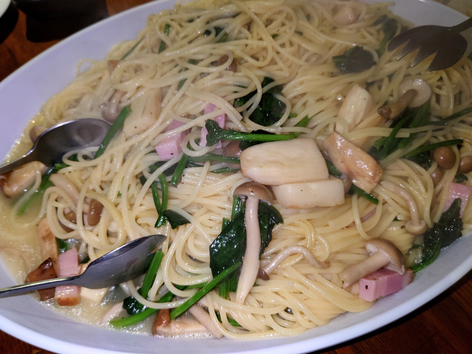〆は、『ベーコンときのことほうれん草のパスタ』。このあたりで『ブラッディ・マリー』を頼んだんだけど、トマトジュース&ウォッカのカクテルとパスタはけっこう相性が良かったり。