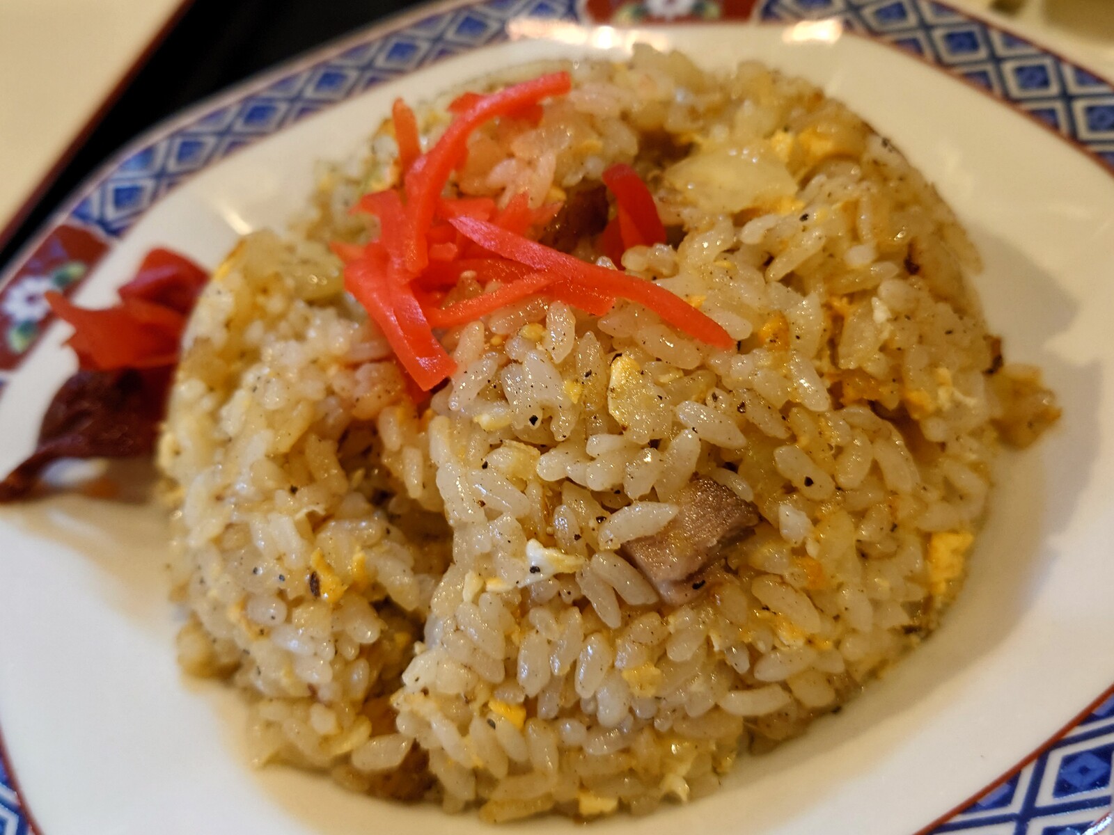 この『チャーハン』が、なかなかにスパイシー。具にはチャーシュー、玉ねぎ、玉子と、いたってスタンダード。昔からある食堂のチャーハンでありながら、でも昔ながらの味というのとはちょっと違う、家では出せないこの店だけの味だったんだ。紅ショウガに福神漬けまでのっているのもうれしいよね。
