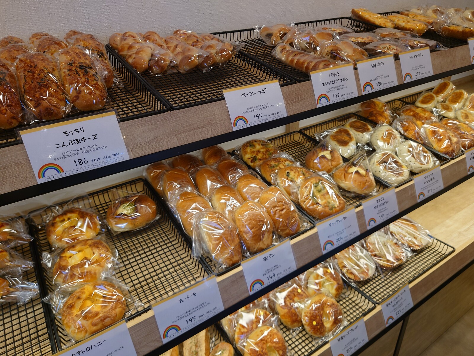 この日は、西田地方にある素敵なパン屋さん「にじパン」でたくさんパンを買い込んだよ。午後の浅めの時間だったから、棚にはけっこうたくさんのパンが並んでいたんだ。