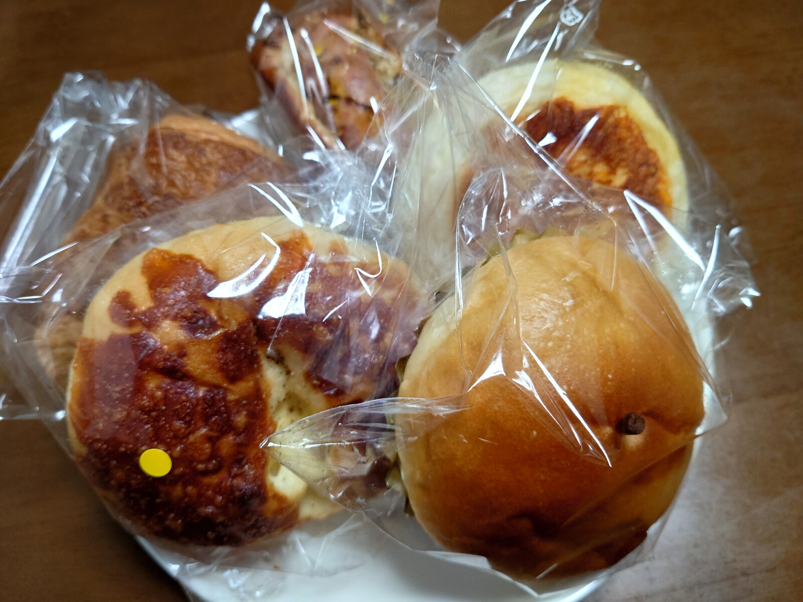 この日購入したのは、こんな感じ。レシートによれば、『チーズフォンデュ』『PIZZA』『ジャイアントB(Bって、なんだったんだろ?)』『特濃チーズブレッド』『パンオショコラ』『まるごとリンゴ』といったラインナップ。