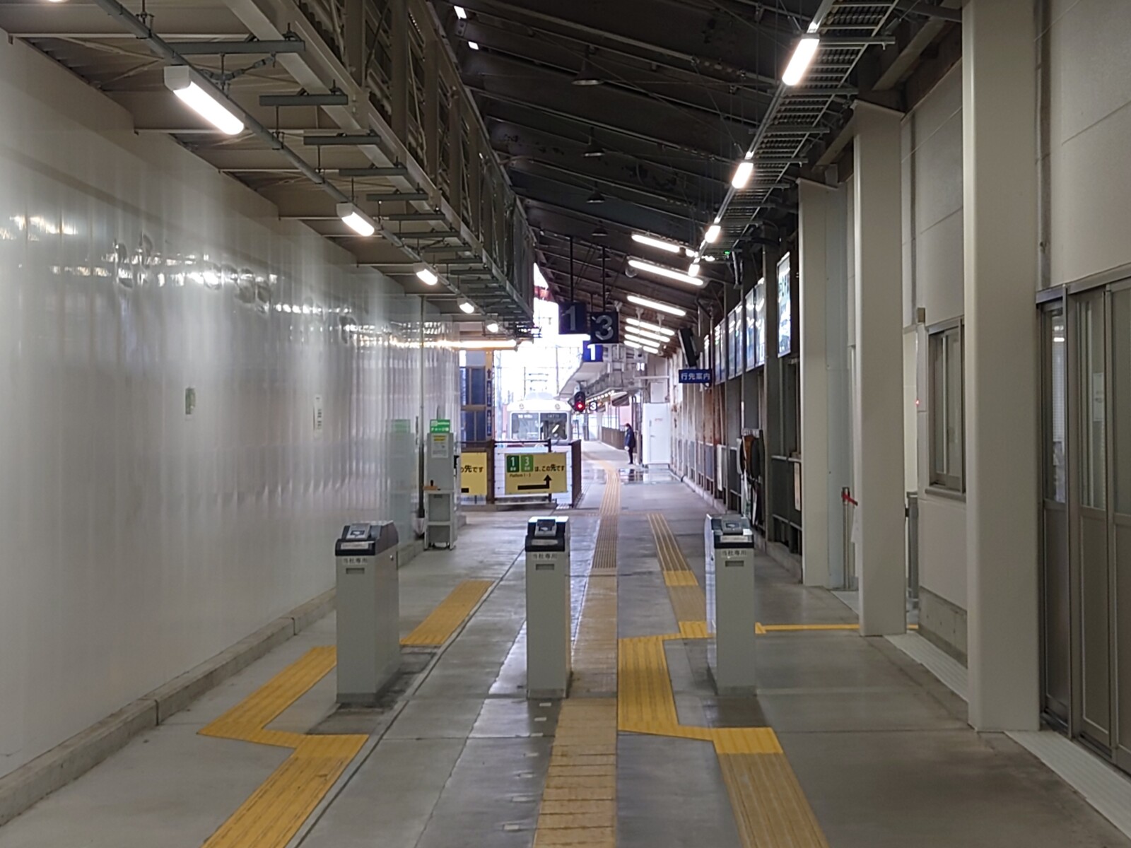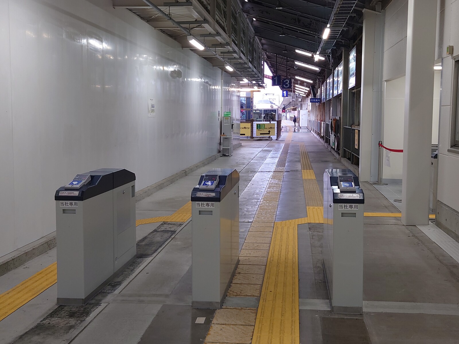 これは、現在の富山地方鉄道電鉄富山駅の風景。1・3番ホームへの通路に改札が設けられているんだ。電鉄富山駅の駅舎の高架化工事がついに始まったんだよね。左の仕切りの奥が工事現場。