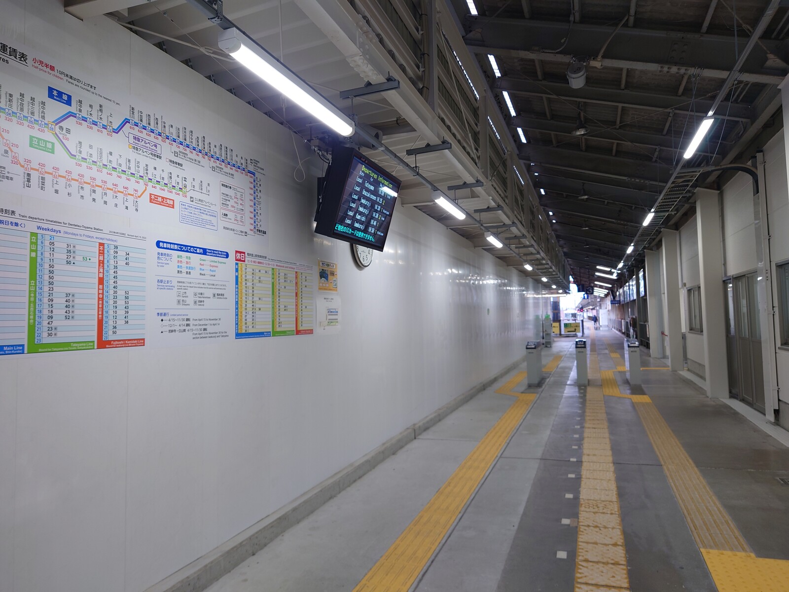路線案内図や時刻表も壁面に掲示。発車する列車の電光掲示が一台設置されていたよ。