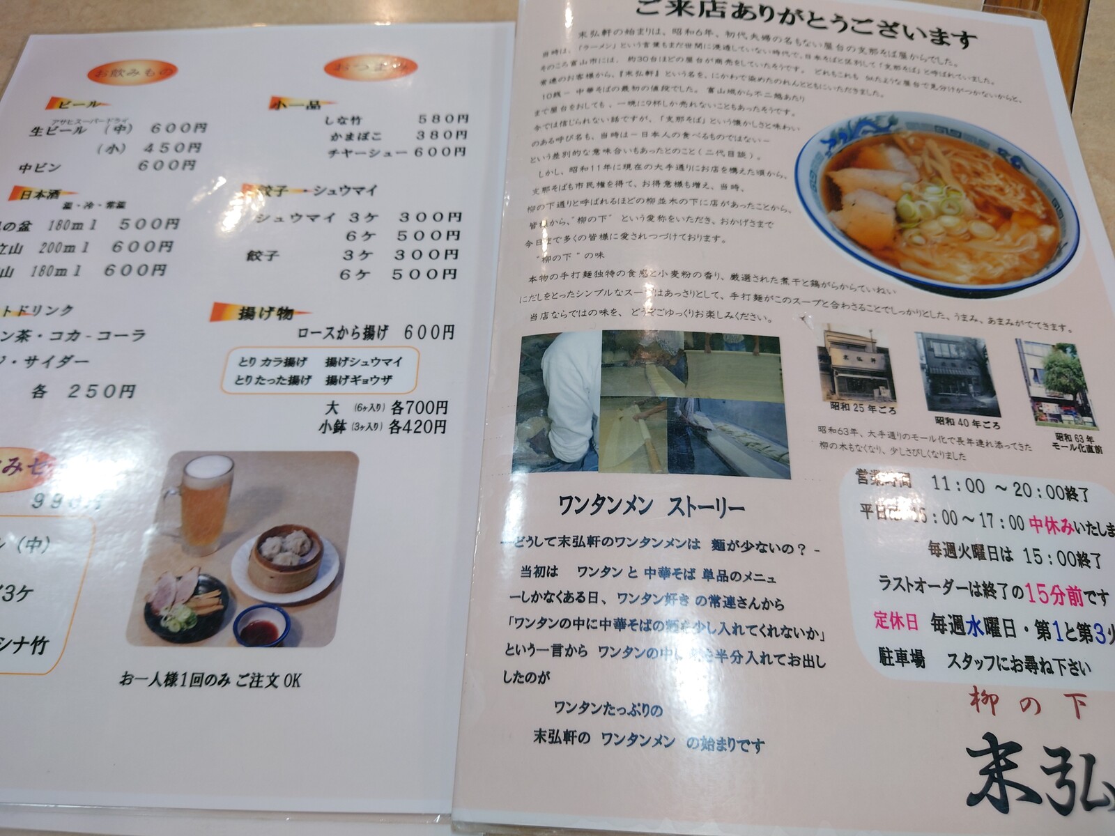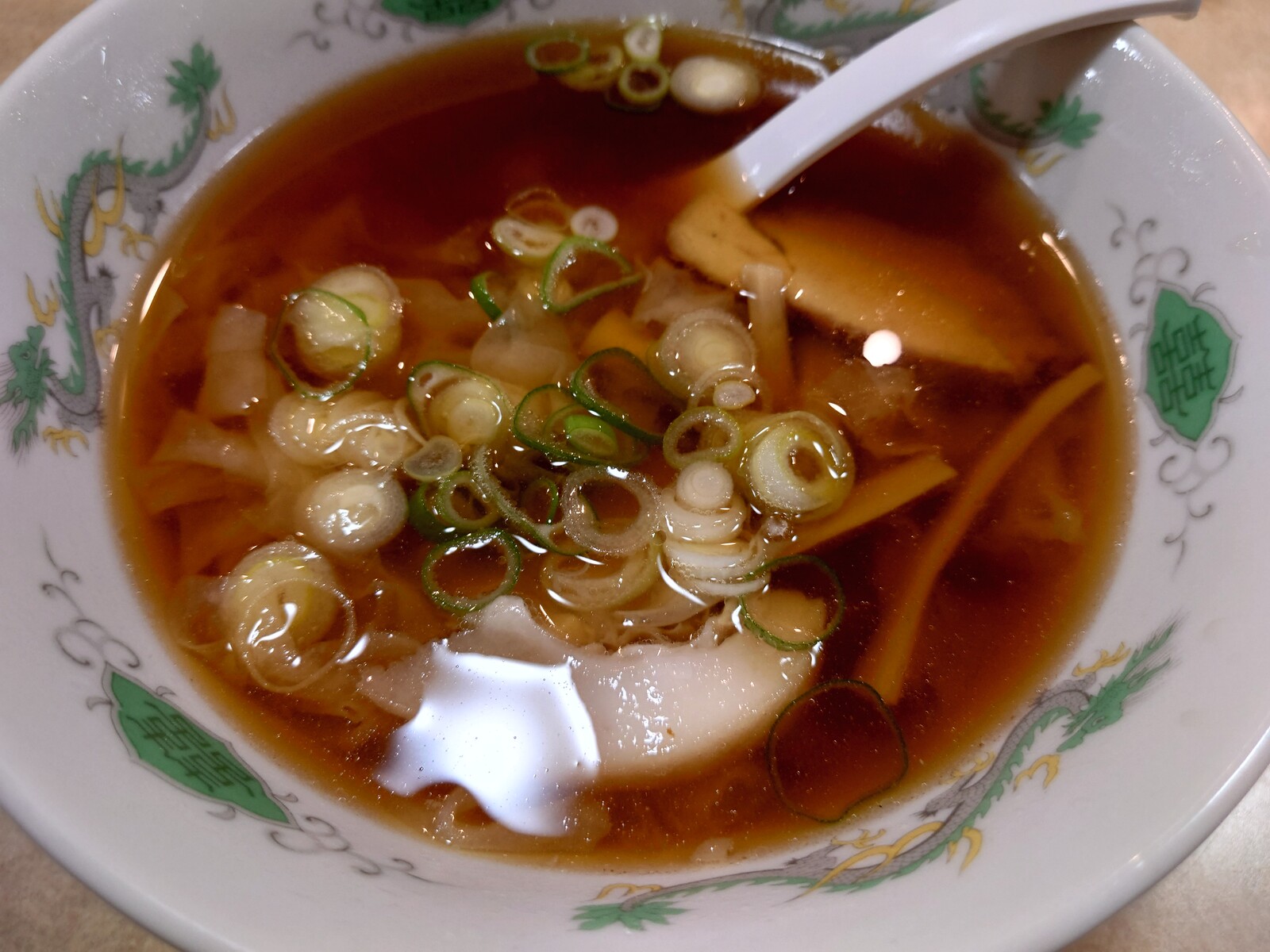 この日は、富山地方鉄道路面電車環状線の大手モール停留所前にある老舗のラーメン店「末弘軒本店」に寄り道してみたよ。ラーメン食べるというよりも、1杯飲みながら一休みすることが目的。だから、麺抜きの『ワンタンだけ』を頼んでみたよ。登場したのがこちら。