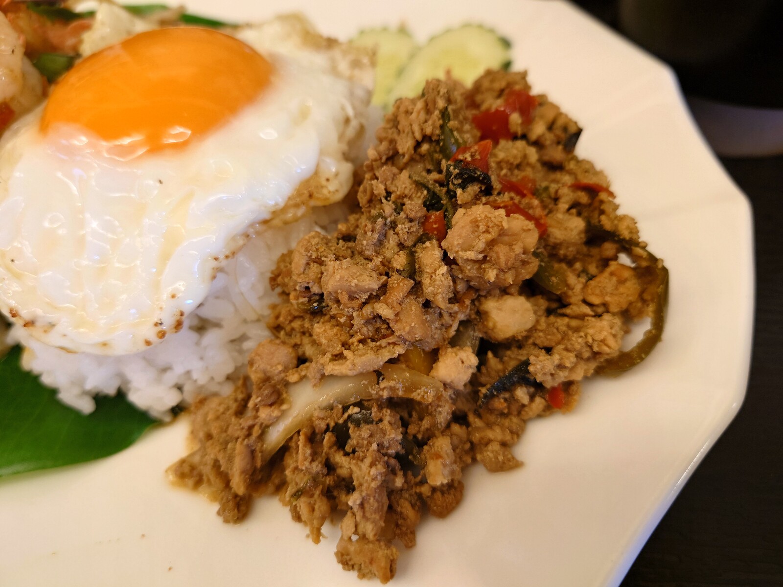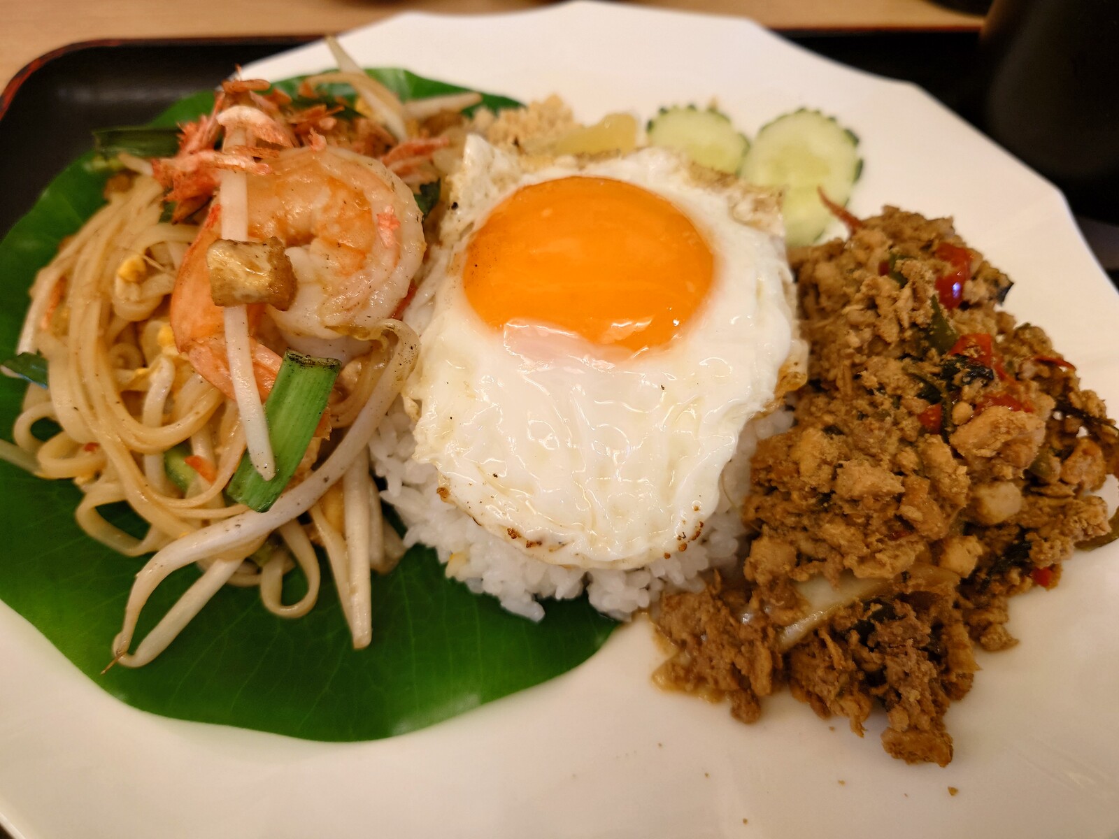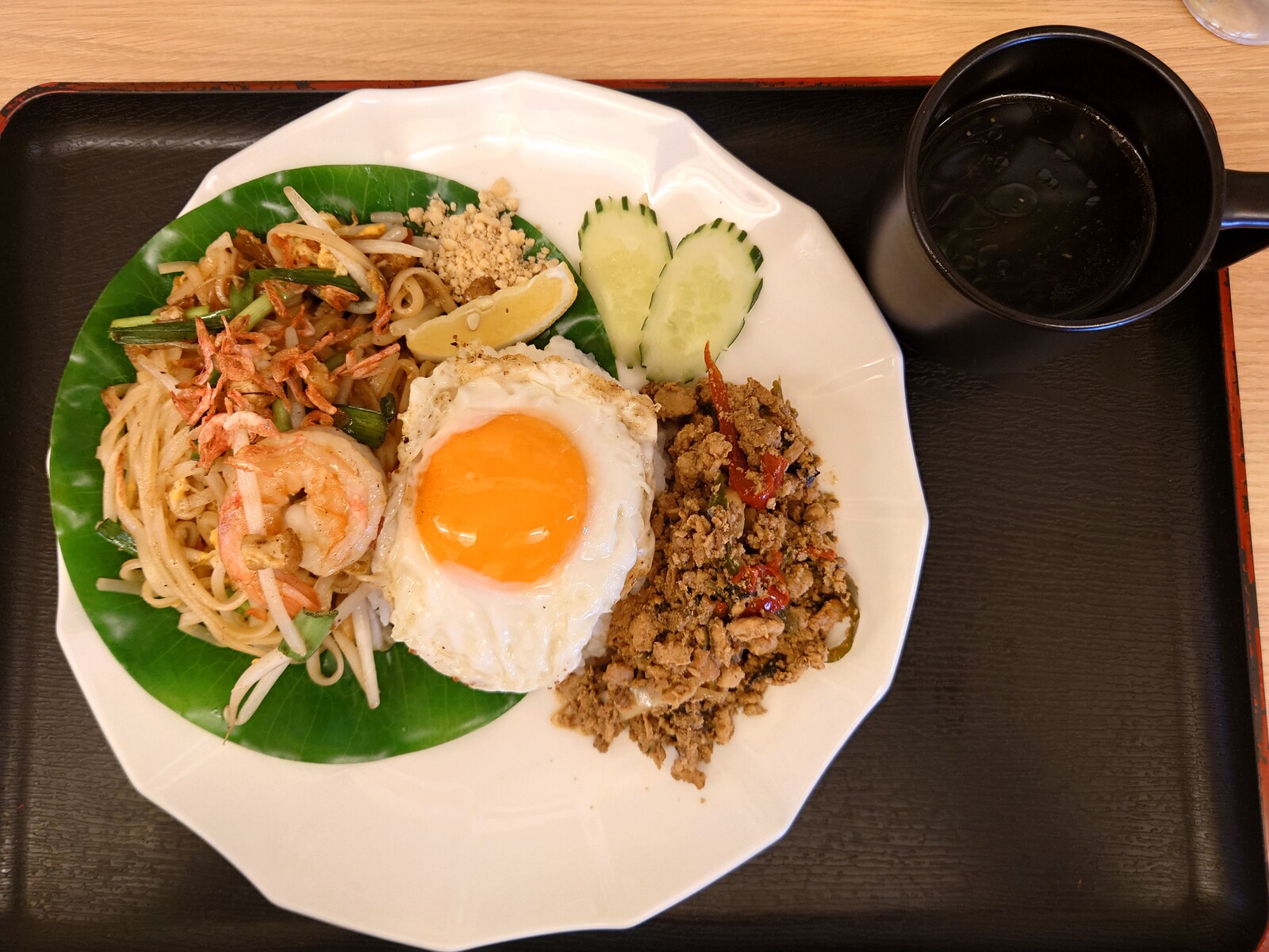 さて、出てきたのは、もはやすっかり有名になった『ガパオライス』とタイ風焼きそば『パッタイ』。ガパオライスといえば、ひき肉、バジルと一緒にタイの調味料で炒めたご飯、というのがイメージだったけど、この店では、具とご飯が別々というスタイル。