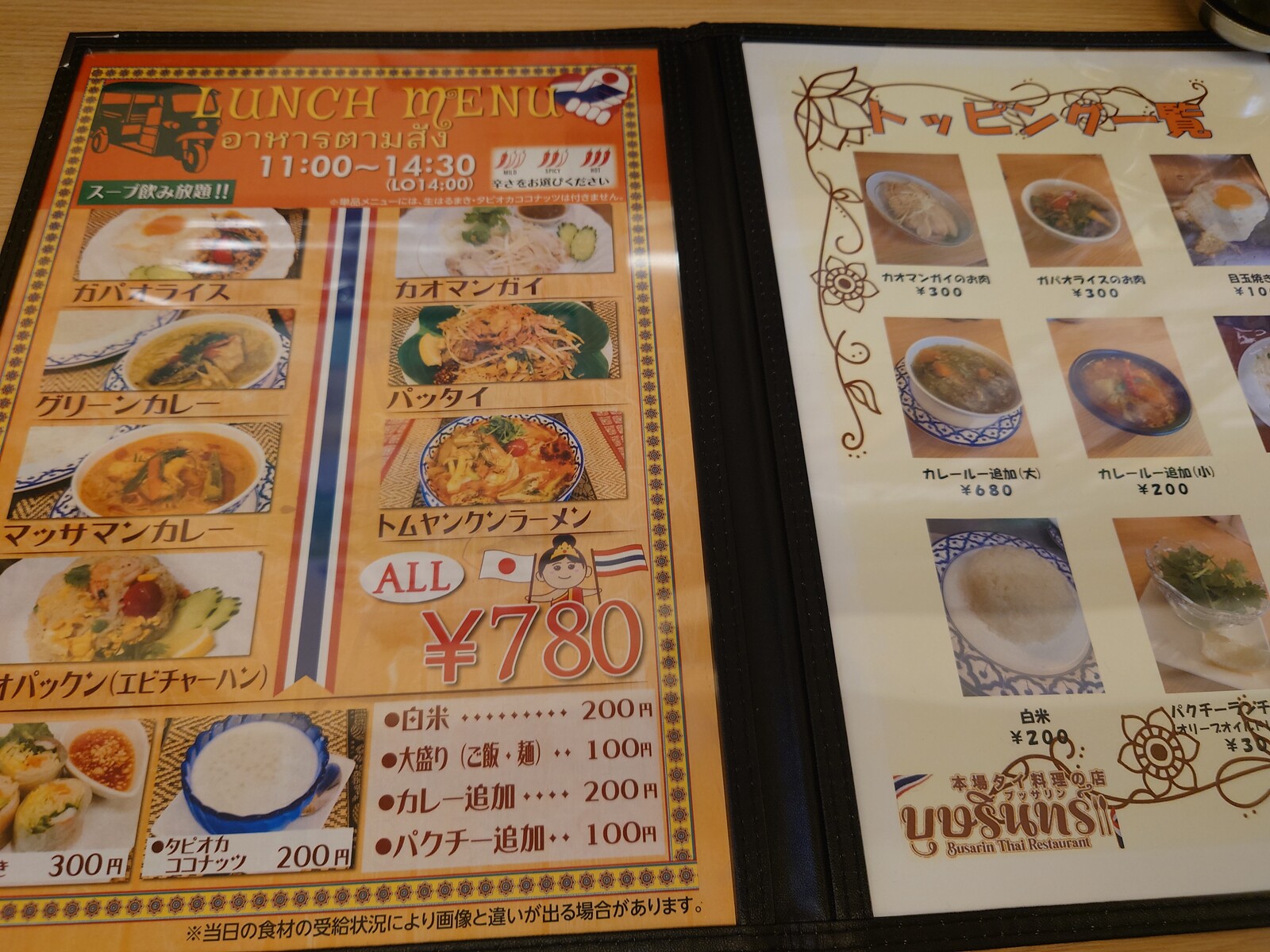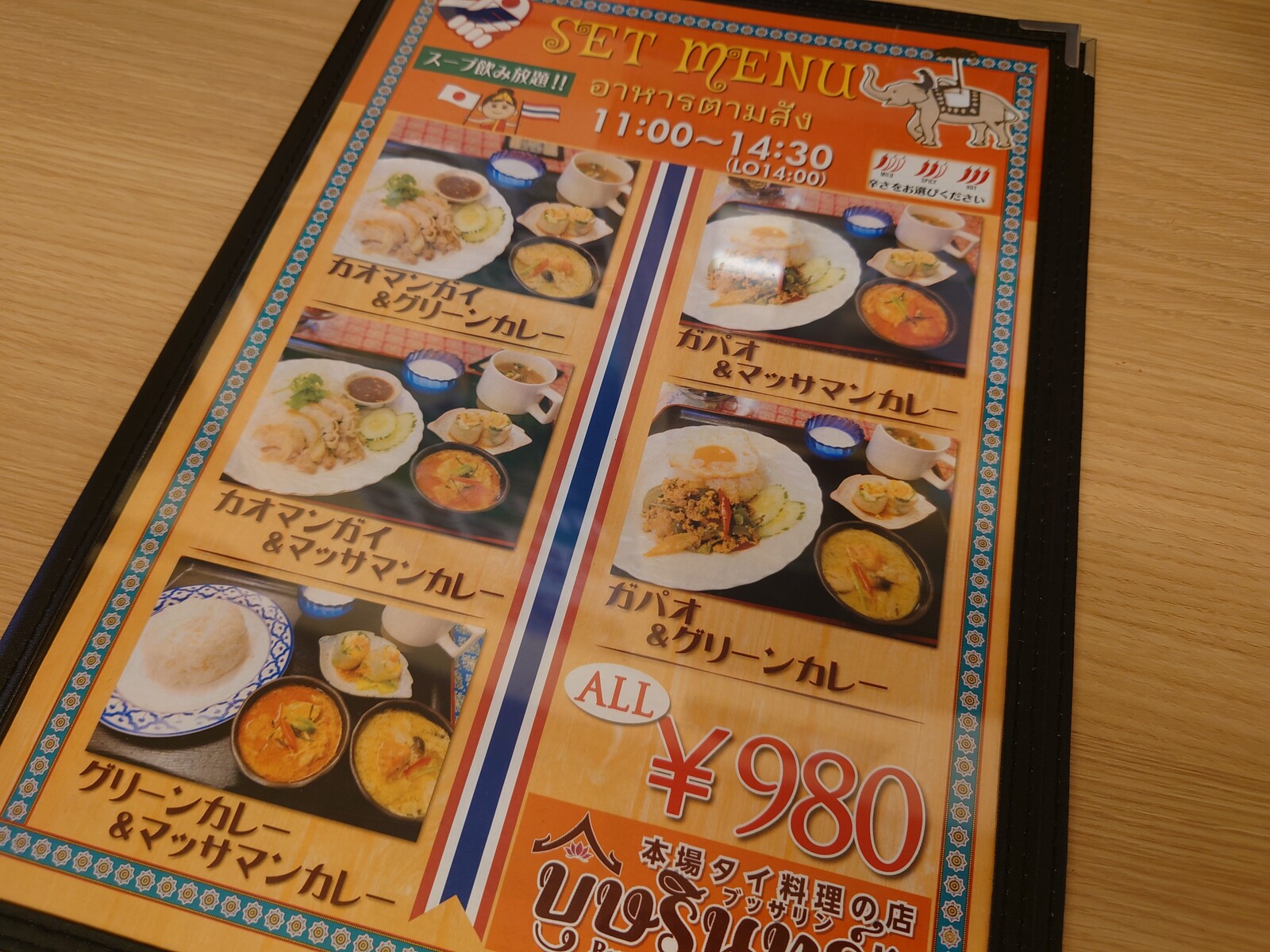 お店の名前は「ブッサリン」。ランチタイムには、種々のカレーやカオマンガイ、ガパオといった、ボクでも知ってるタイ料理を組み合わせたランチが、多彩に用意されているよ。ボクが注文したのは、『ガパオライス&パッタイ』のセット。スープは飲み放題で、自分でサーブするシステムだったな。