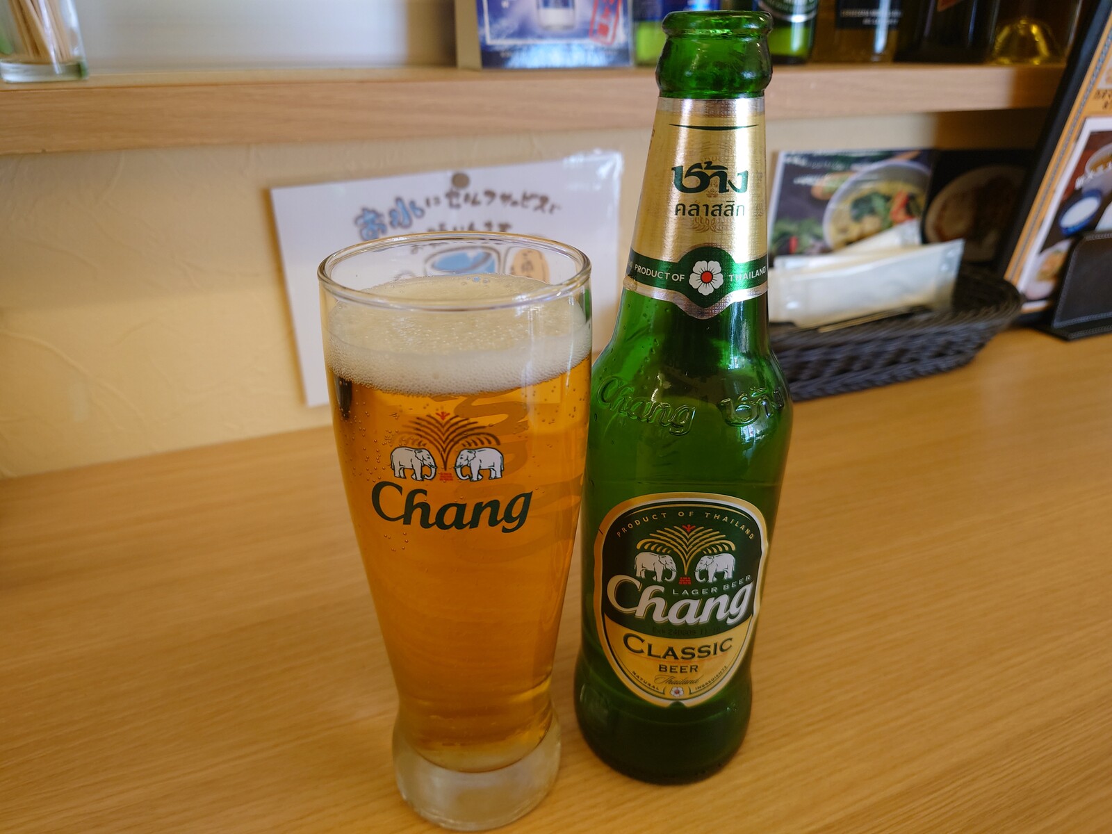 さて、バスで来たからには、昼ビールといこうではないか。この店には、3種のタイビールをラインナップしてたよ。『シンハー』は以前どこかで呑んだ記憶があったから、この日のチョイスは『チャーン』なのだ。