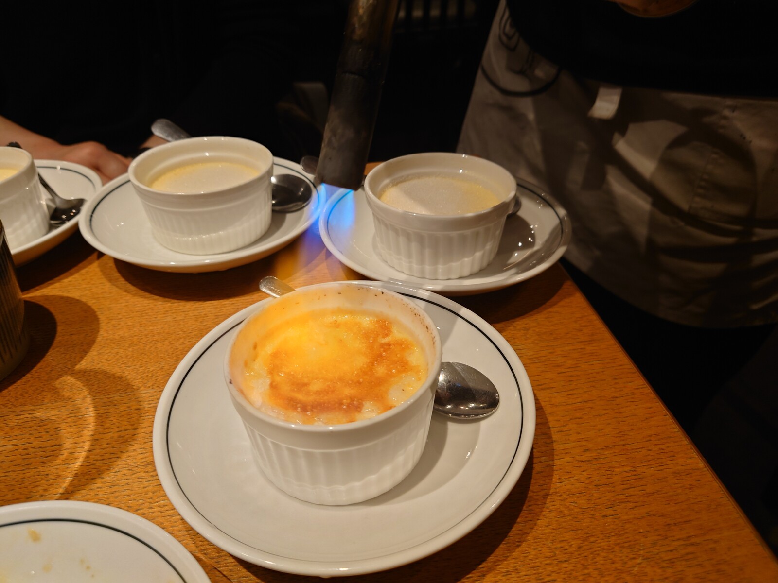 最後にデザートをいただくことに。『焼きプリン』は、表面を目の前であぶって、クリームブリュレみたいに仕上げる一品。ガスバーナーが熱々で、あっという間に焦げていくのだ。そして、その焦げ目の香ばしさと苦みが、食欲をそそるのだ。
