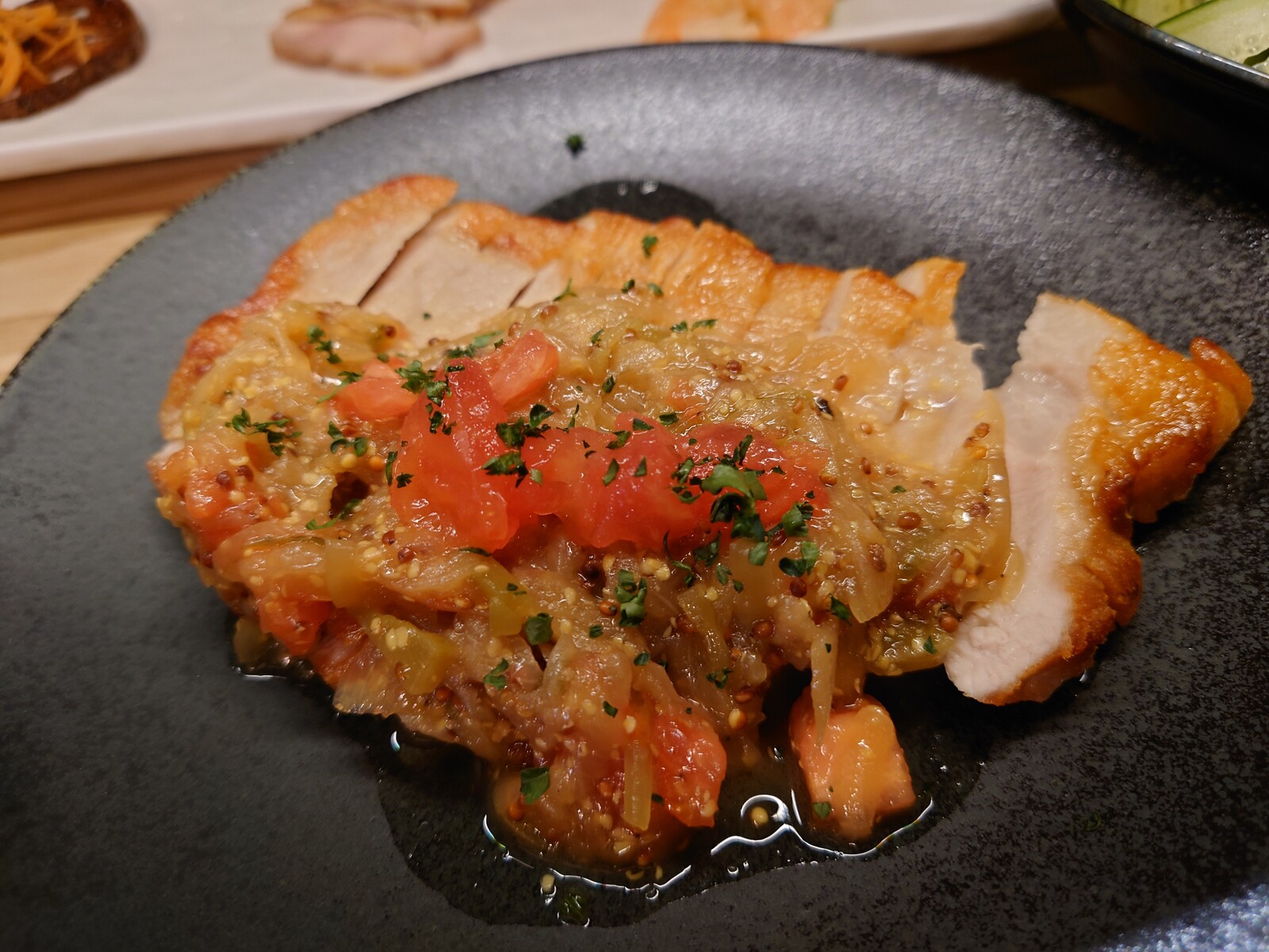 そんなワインと一緒にいただいたのが、『週替わりお肉セット』。この日のメインは『豚ロースのソテー シャルキュティエール』だったよ。オードブルが3品に、サラダ、スープがついてきたんだ。