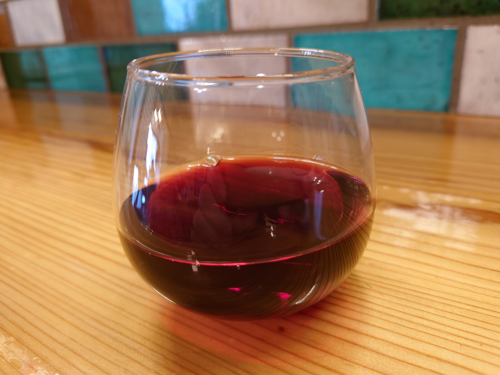足のないグラスがカジュアルな雰囲気だね。信州メルローは、タンニンがしっかりきりっと効いていて、若さを感じるワインだったよ。そして、ちゃんとメルローらしい味わい。日本のワインもなかなかやるもんだ。