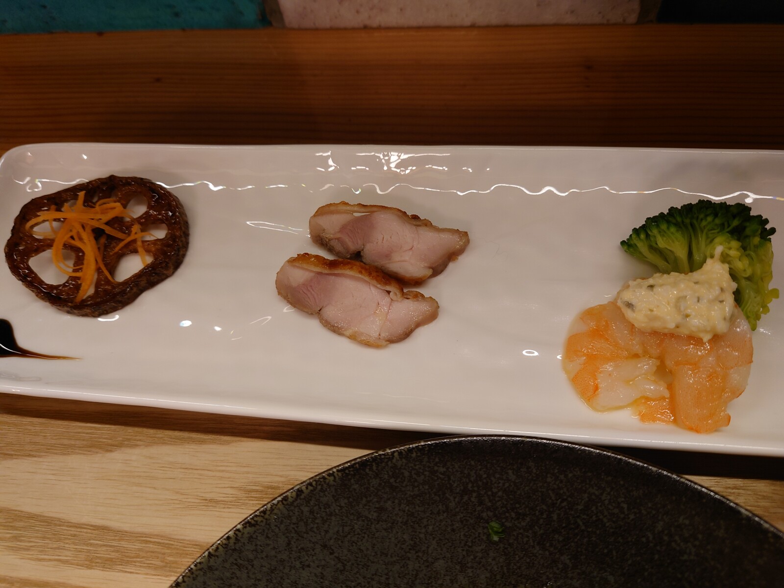バルサミコソースで包んだれんこん、鴨のスモーク、海老のタルタルと、納得のオードブルも素晴らしい。