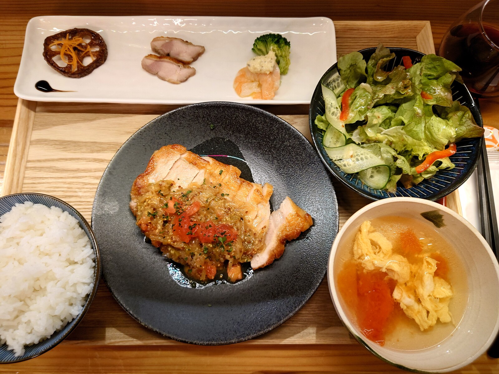 。そんなワインと一緒にいただいたのが、『週替わりお肉セット』。この日のメインは『豚ロースのソテー シャルキュティエール』だったよ。オードブルが3品に、サラダ、スープがついてきたんだ。