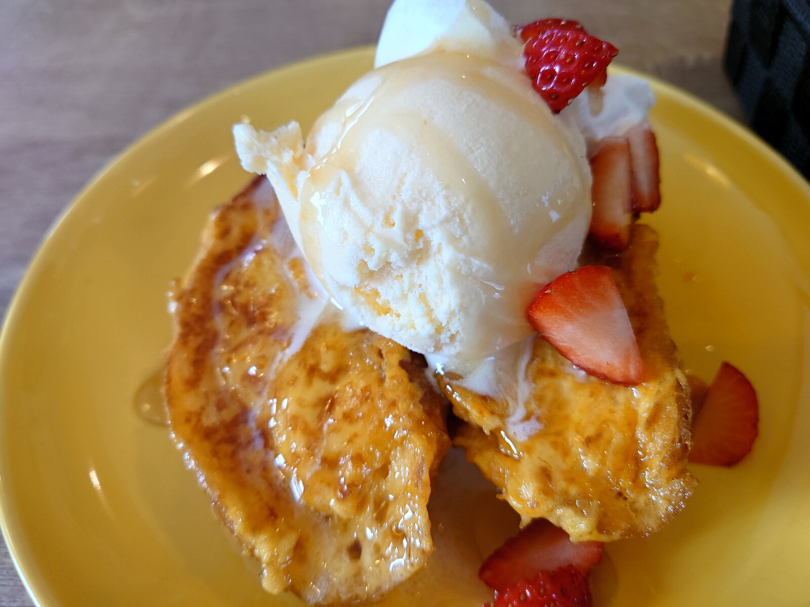 バケットにメープルシロップを芯まで漬け込んで、バターで焼いたフレンチトーストに、さらにアイスクリームとホイップクリーム、いちごをのせた、甘々な一品。でも、その容赦ない甘さが、メープルとバターの香りに包まれて、得も言われぬ一品に仕上がっていたんだ。いやはや、何とも美味〜。