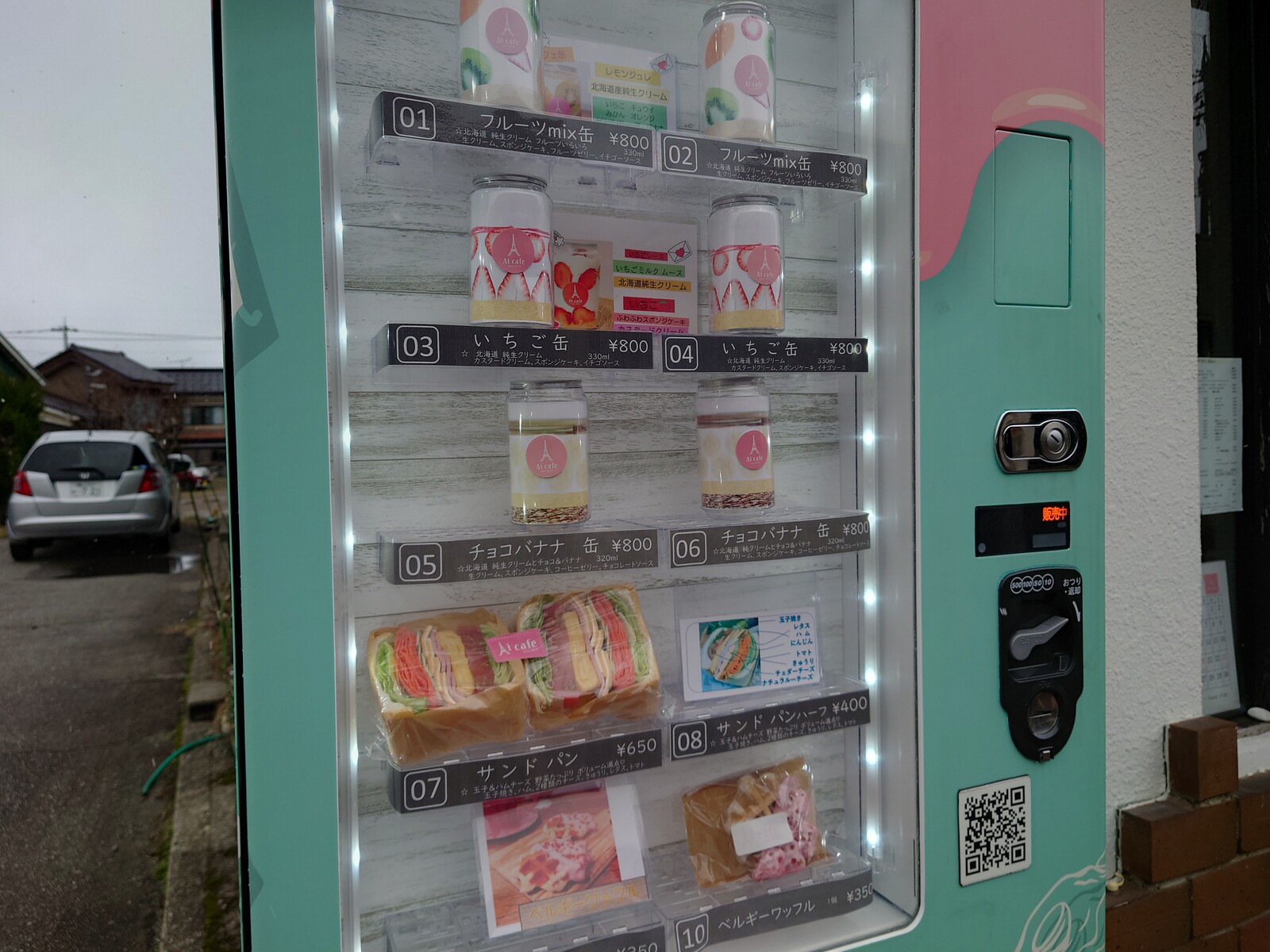 そして、このお店、店前にパフェ缶の自販機を置いてるんだ。これもまた、一度味わってみたいと思ったり。