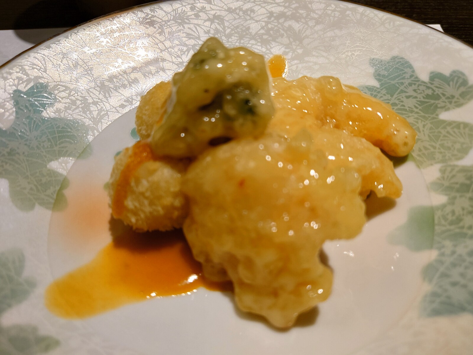 あんかけになったエビの天ぷらは、このあんかけの味わいが絶妙。天ぷらの衣がサクサクしたまま、味わい深いっていうのが、とってもいいのだ。