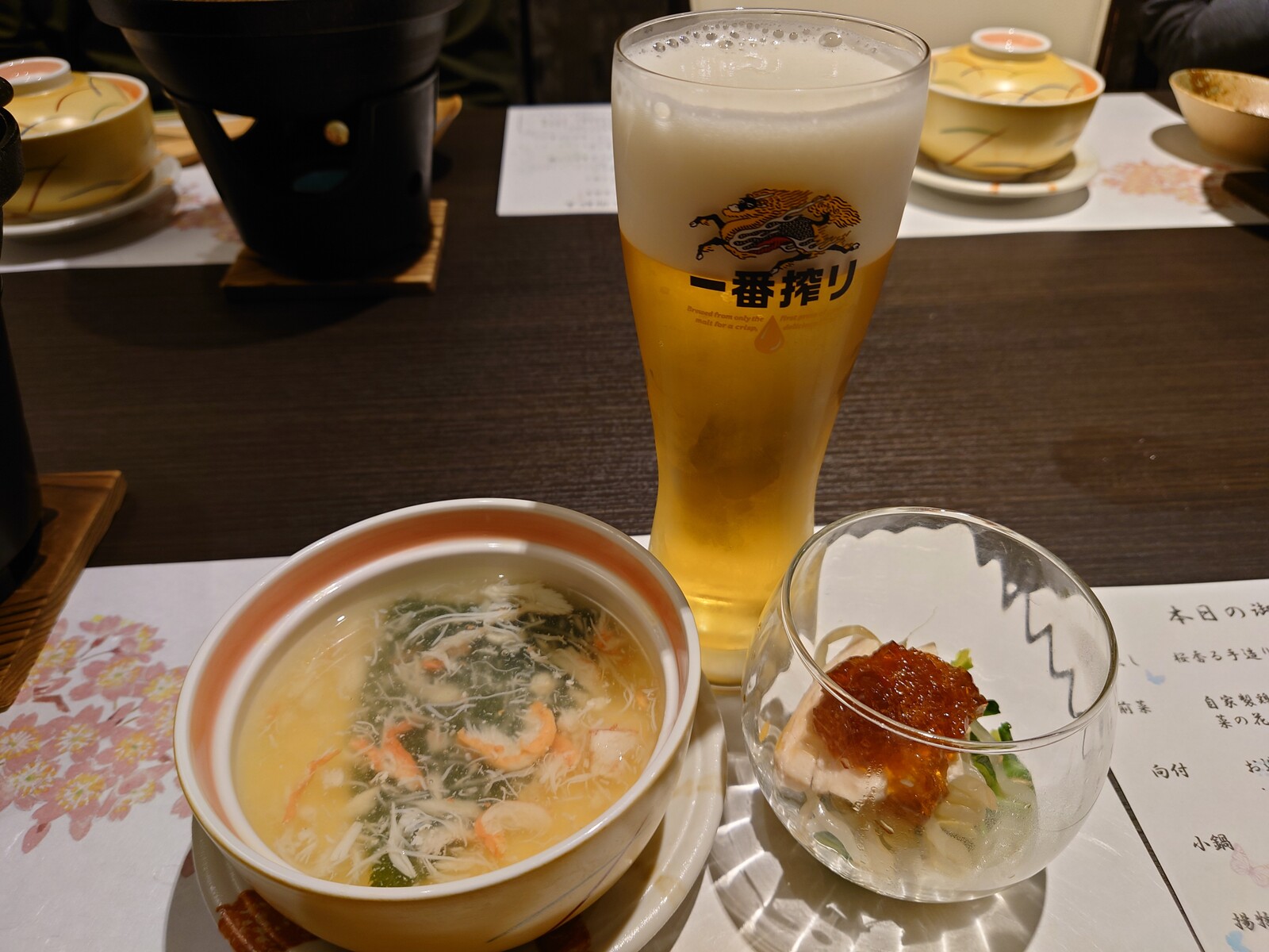 。突き出しには、桜の葉の香る茶わん蒸し。カニが入っていて、豪華な感じの一杯だったよ。誠にもって素晴らしい。
