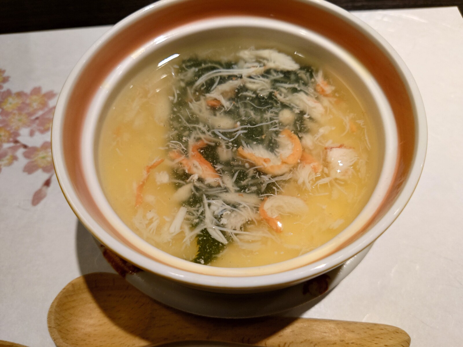 突き出しには、桜の葉の香る茶わん蒸し。カニが入っていて、豪華な感じの一杯だったよ。誠にもって素晴らしい。