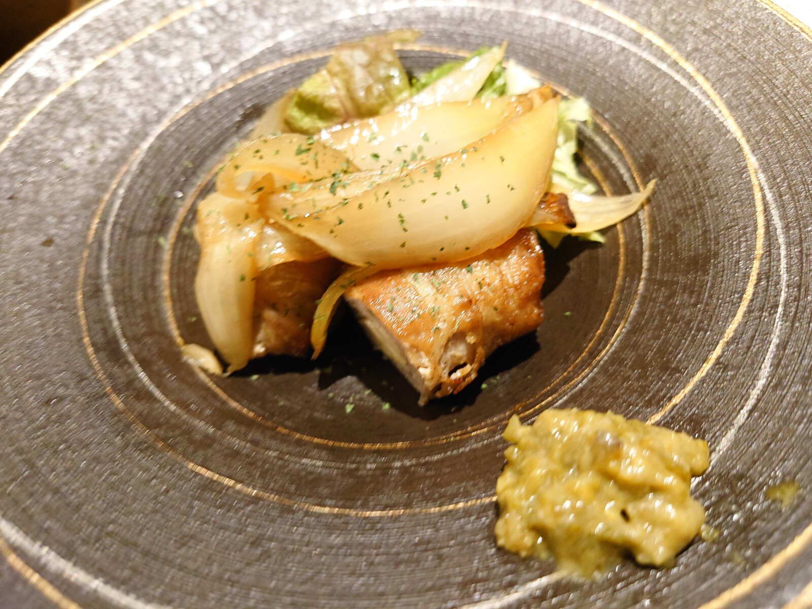 皮をカリカリに焼き上げたチキンは、玉ねぎの甘みと一緒にいただけば、さらにうまさがグレードアップ。
