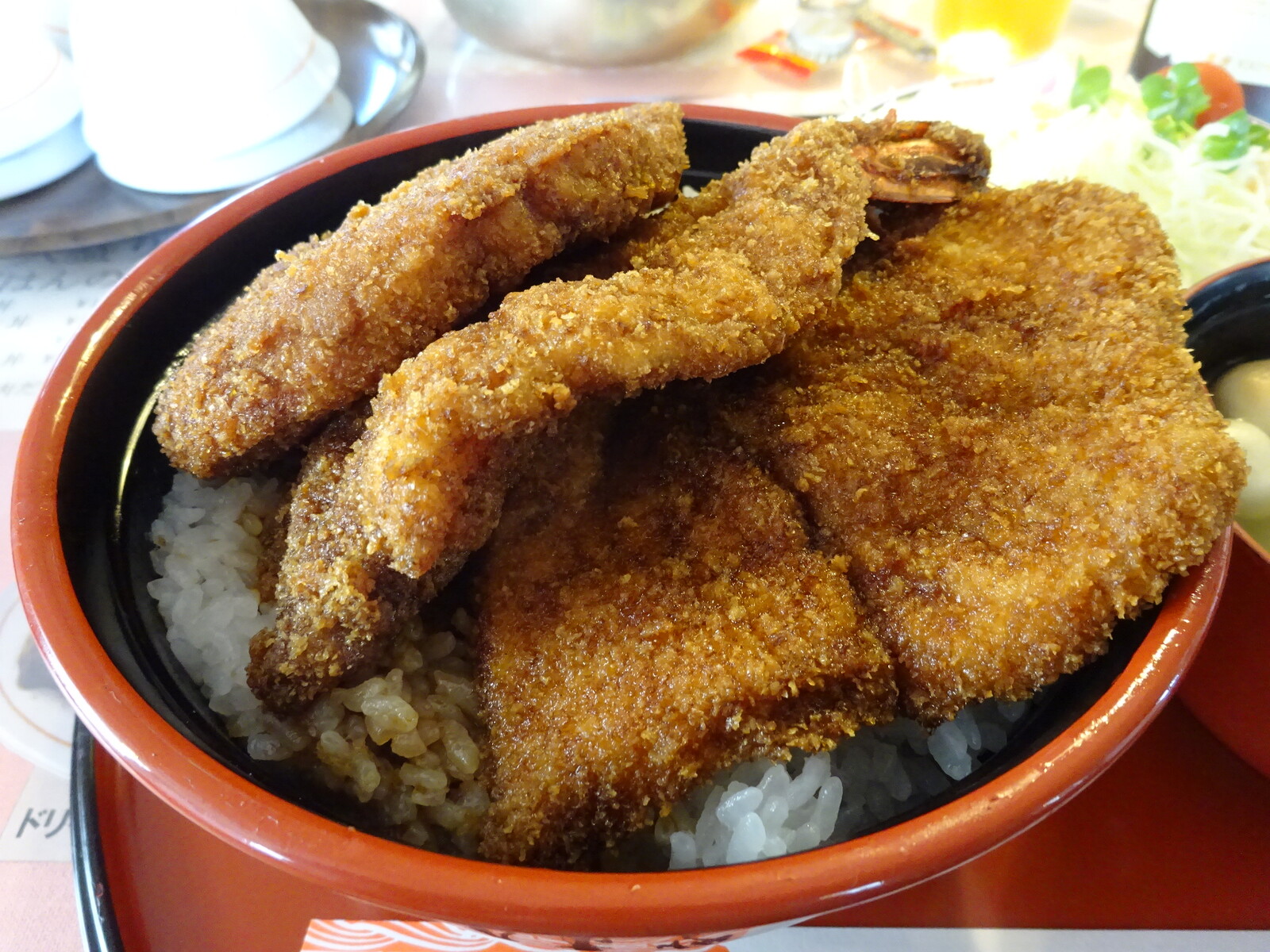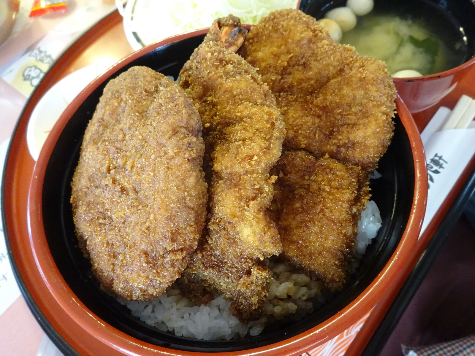 この日のボクのチョイスは、カツと一緒にメンチカツ、海老フライをのせた「デラックス丼」。めったに来れるところではないから、いろんな味を試してみたいではないか。かくして登場したのがこちら。サラダ、みそ汁付きのセットにしたよ。