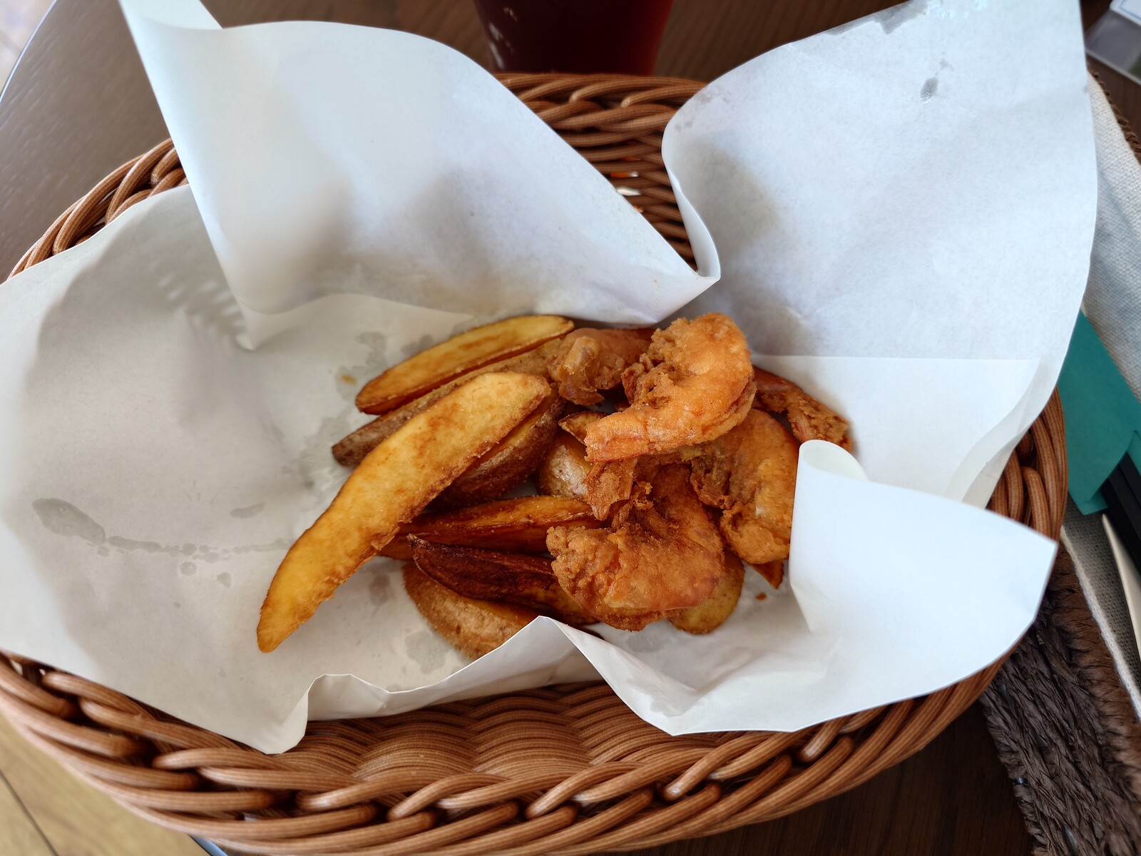 ビールとセットにできる『おつまみセット』は、『フライドポテト&かりかりえび』を選んだよ。登場したのがこちら。