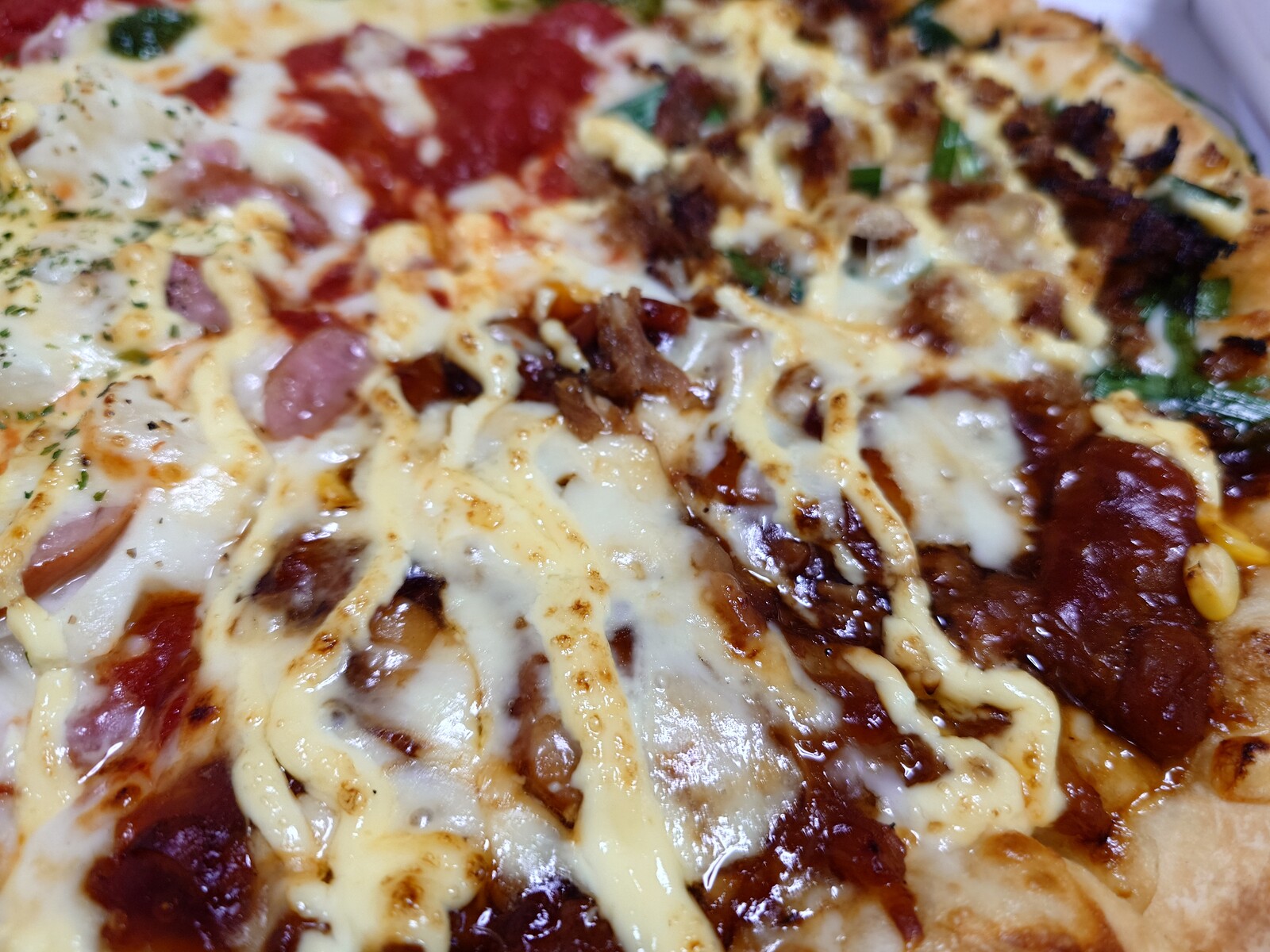 ピザハット人気の4種『ほっくりポテマヨソーセージ』『ピザハット・マルゲリータ』『新・特うまプルコギ』『テリマヨチキン』をトッピングしたピザなのだ。