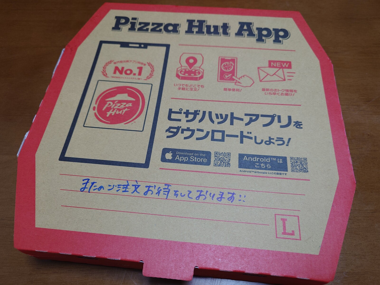 こちらが「ピザハット」のケータリング用の箱。赤が基調になっているのが、ピザハット風だね。