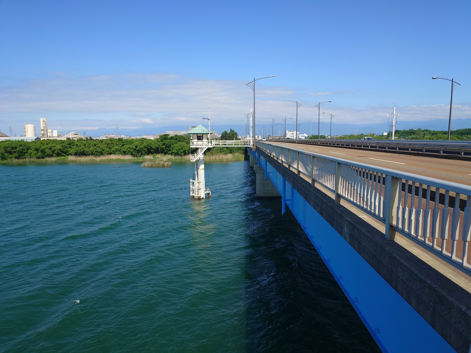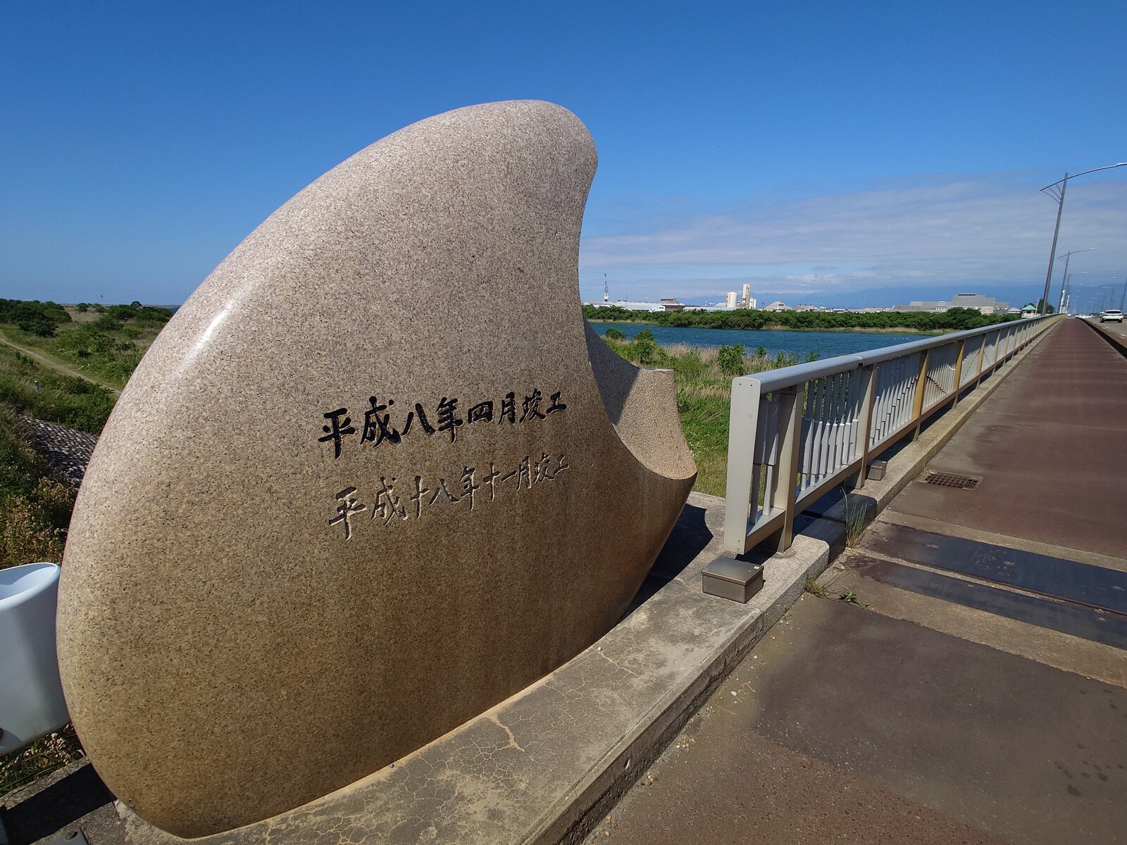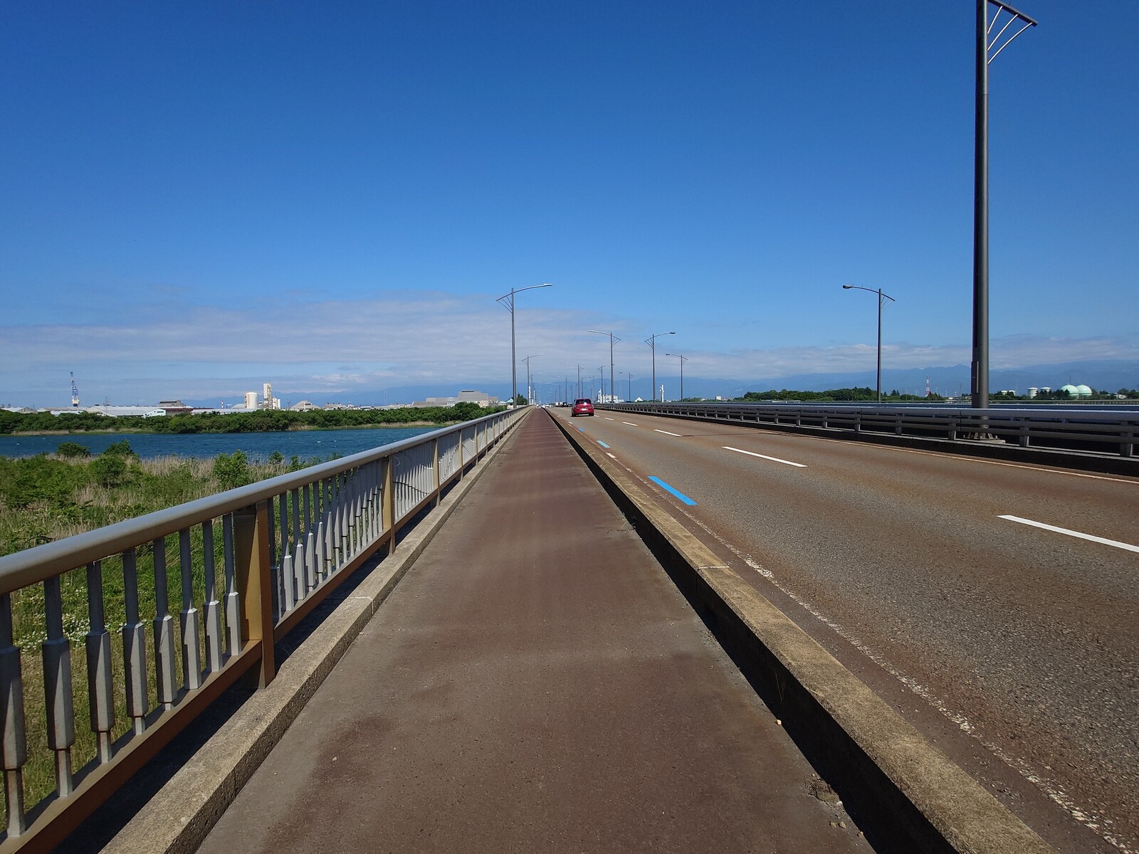 この日は、青空がとても気持ちいい日だったから、神通川のもっとも下流に架かる橋「萩浦橋」を、歩いて渡ってみたんだ。車で通ったことは何度となくあるけど、自分の足で渡るのは初めて。