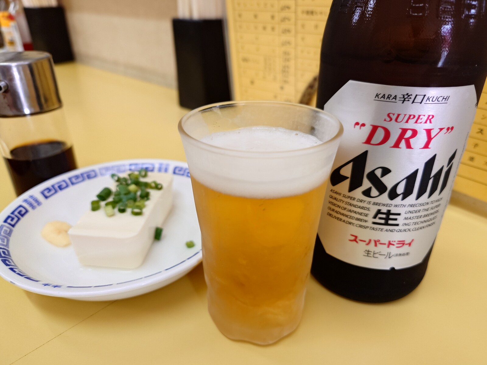 とはいえ、近ごろ流行りの町中華屋さん。一度は訪れてみたいと、この日は富山駅から歩いてここまでやってきたのだ。さあ、Asahiの『スーパードライ』で乾杯といこうではないか。