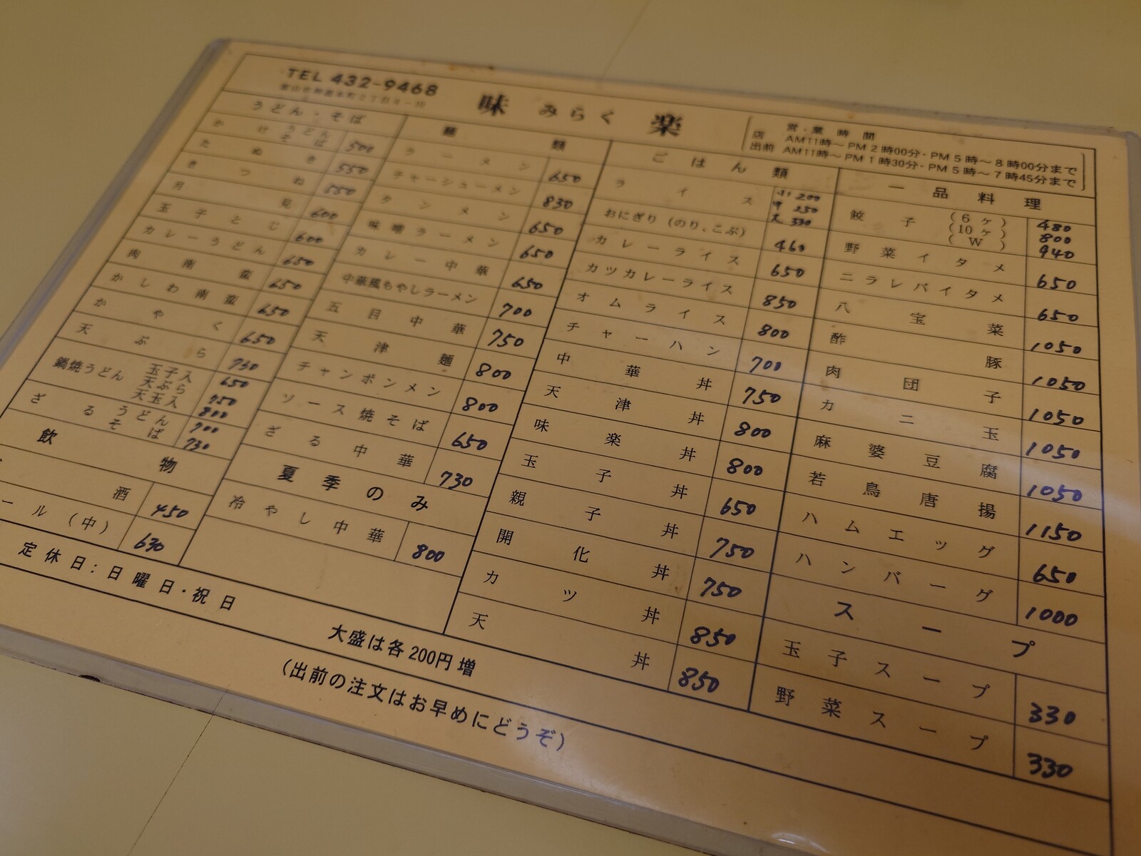 このお店も、前々から気になっていたんだけど、なかなか入ることのできなかったお店。新富町から神通大橋へと向かう道路沿いの左側にある中華料理店「味楽」なんだ。何しろ、日曜日はお休みだし、駐車場があるかよくわからなかったしね。