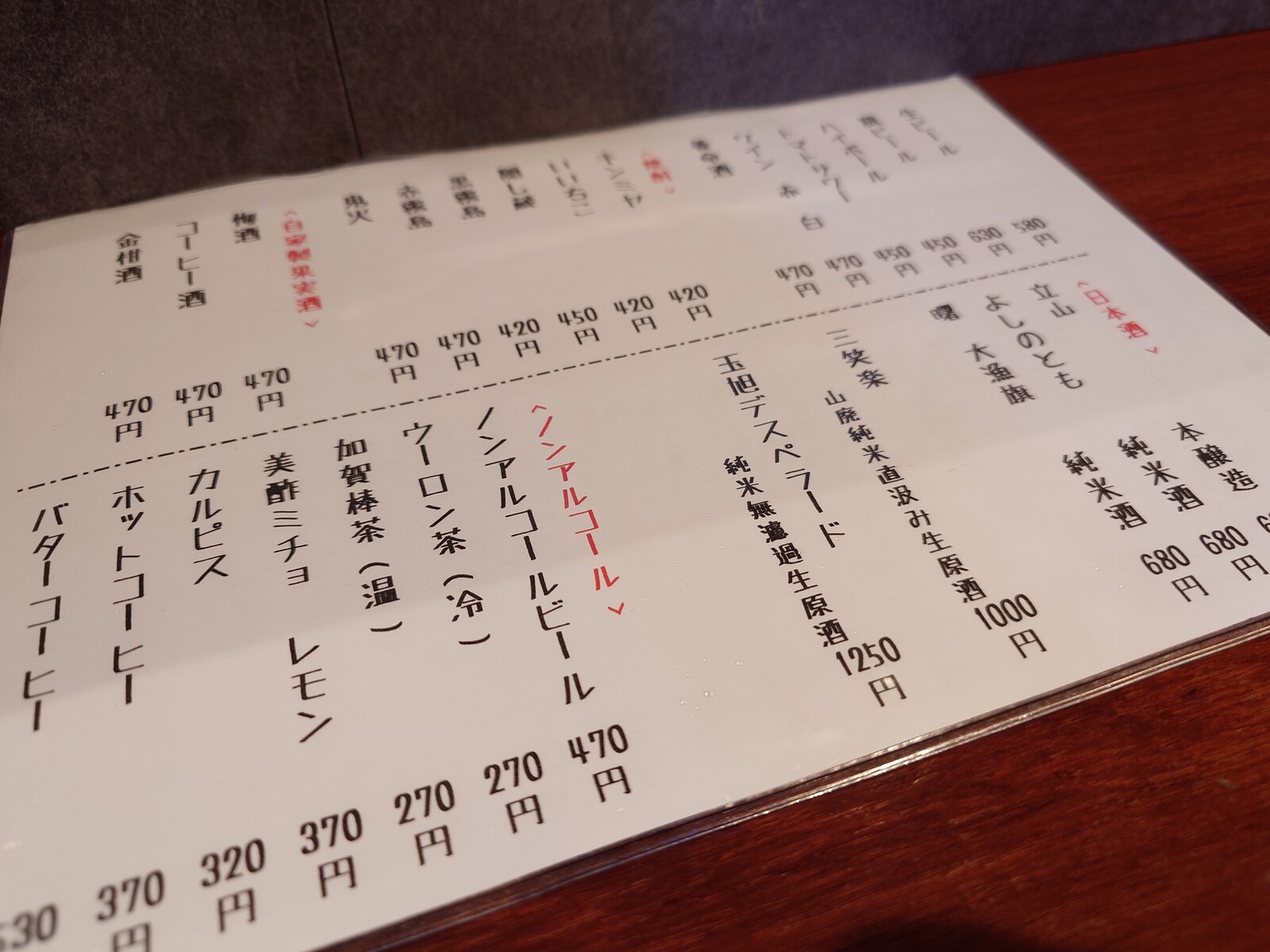 お酒もスタンダードなところを押さえてあって、ささやかなひと時を楽しむには、十分なラインナップ。『金柑酒』とか『バターコーヒー』とか、気になる品々もあるなぁ。