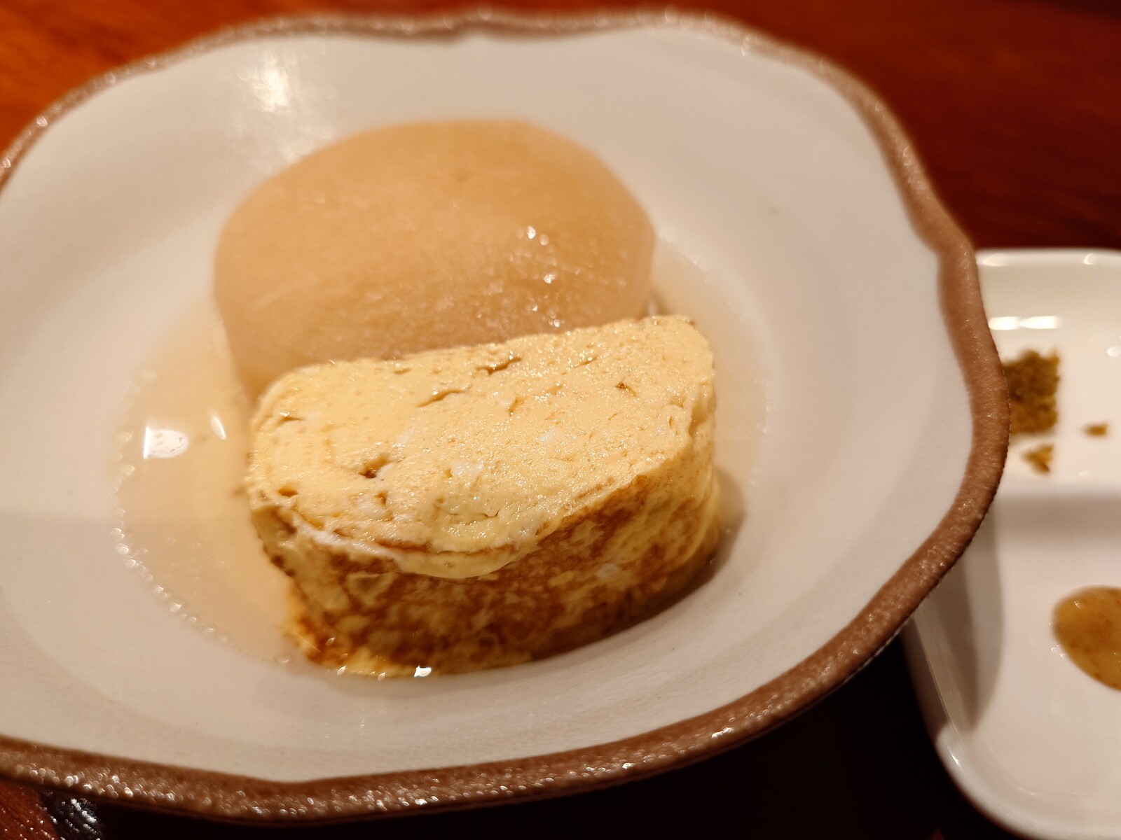 『おでん』があったから頼んでみたよ。大根が、これまた実に味しみしみで、見事な一品だったよ。玉子はゆで卵ではなくて『だし巻き玉子』だったから、珍しくて頼んでみたんだ。煮込んだわけではなくて、『だし巻き玉子』にさらにだしをかけたという一品だったけど、その味わいがまたすばらしかったんだ。