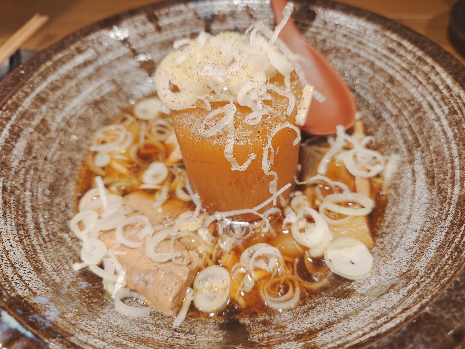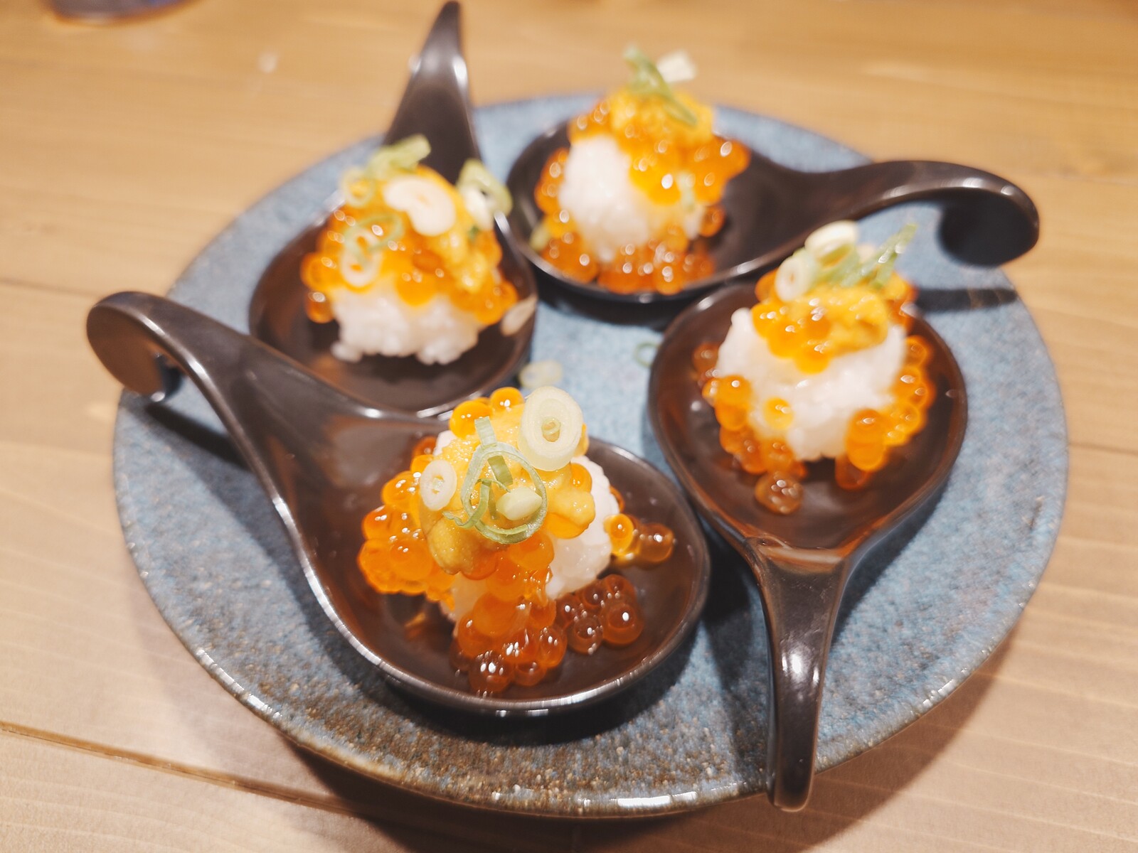 このお店、お料理もまた素晴らしかったんだよね。最初に登場したのは『れんげ寿司』。イクラをたっぷりのせたお寿司がれんげの上にのってるこのお寿司、一口でぺろりと入って、口の中にプチプチがひろがる絶品だったんだ。酢飯の味が実にいい感じだったよ。