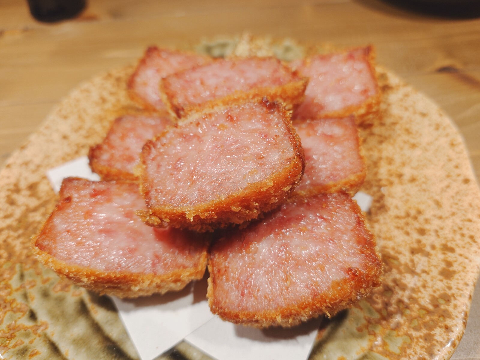 厚く切ってごろごろ揚げたジューシーな『雲仙ハムカツ』。ハム自体がうまいから、揚げても当然うまいのだ。