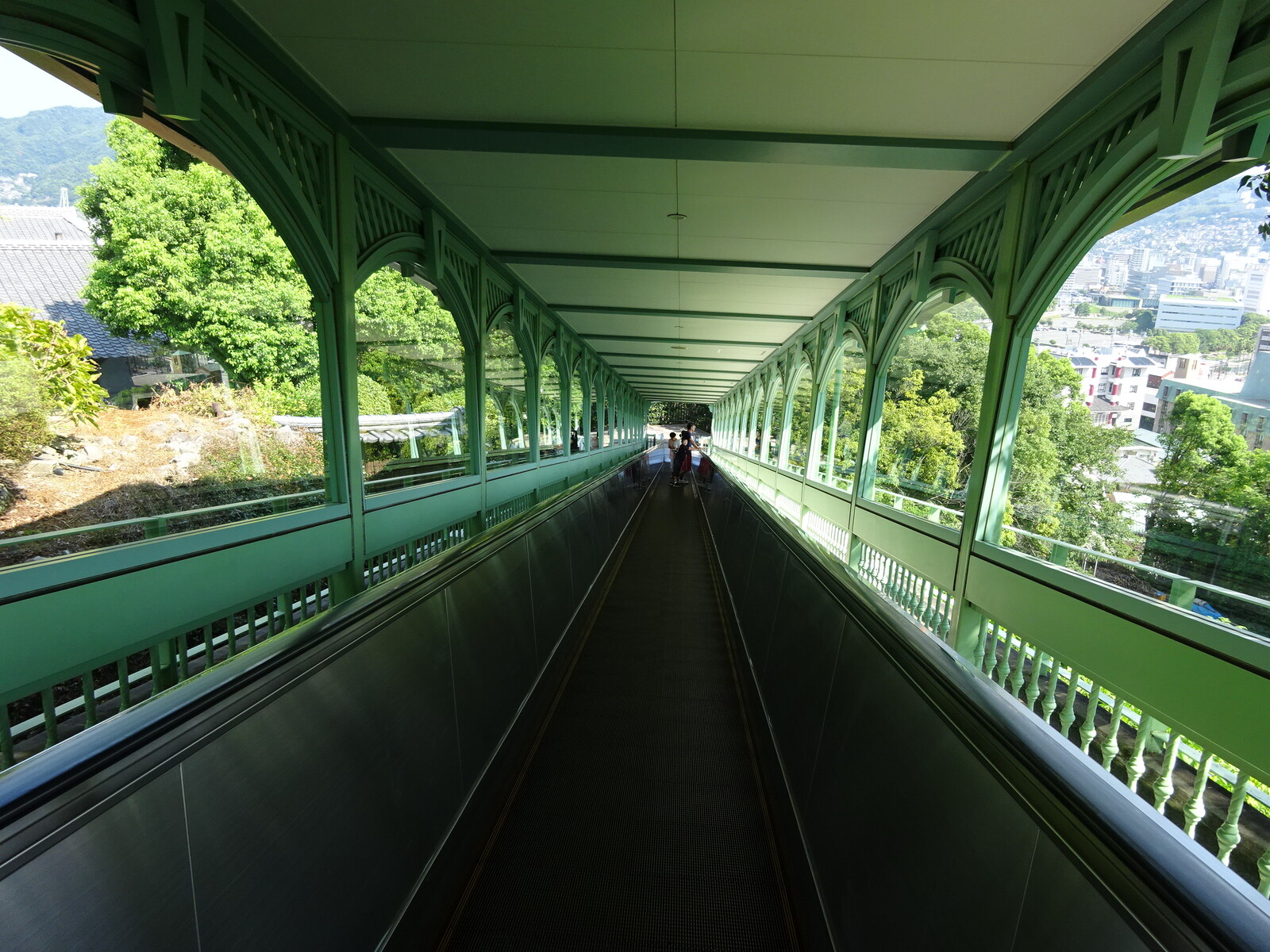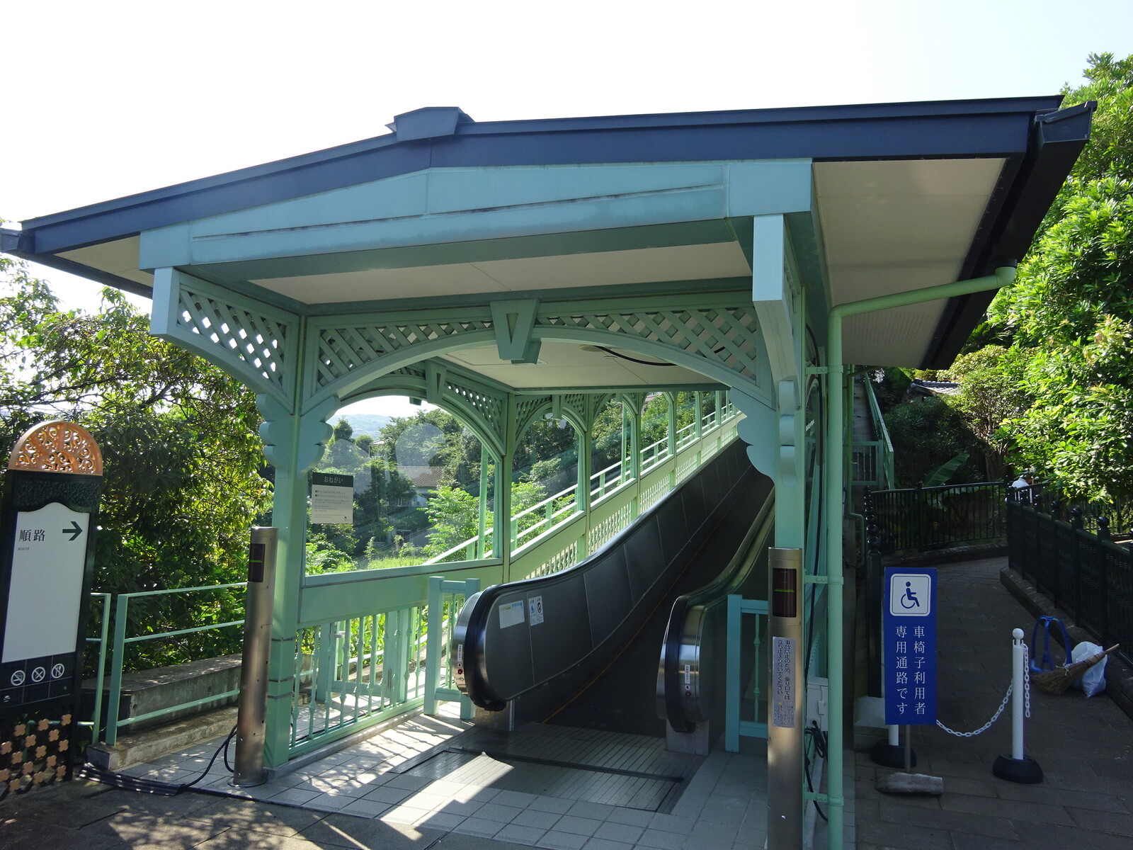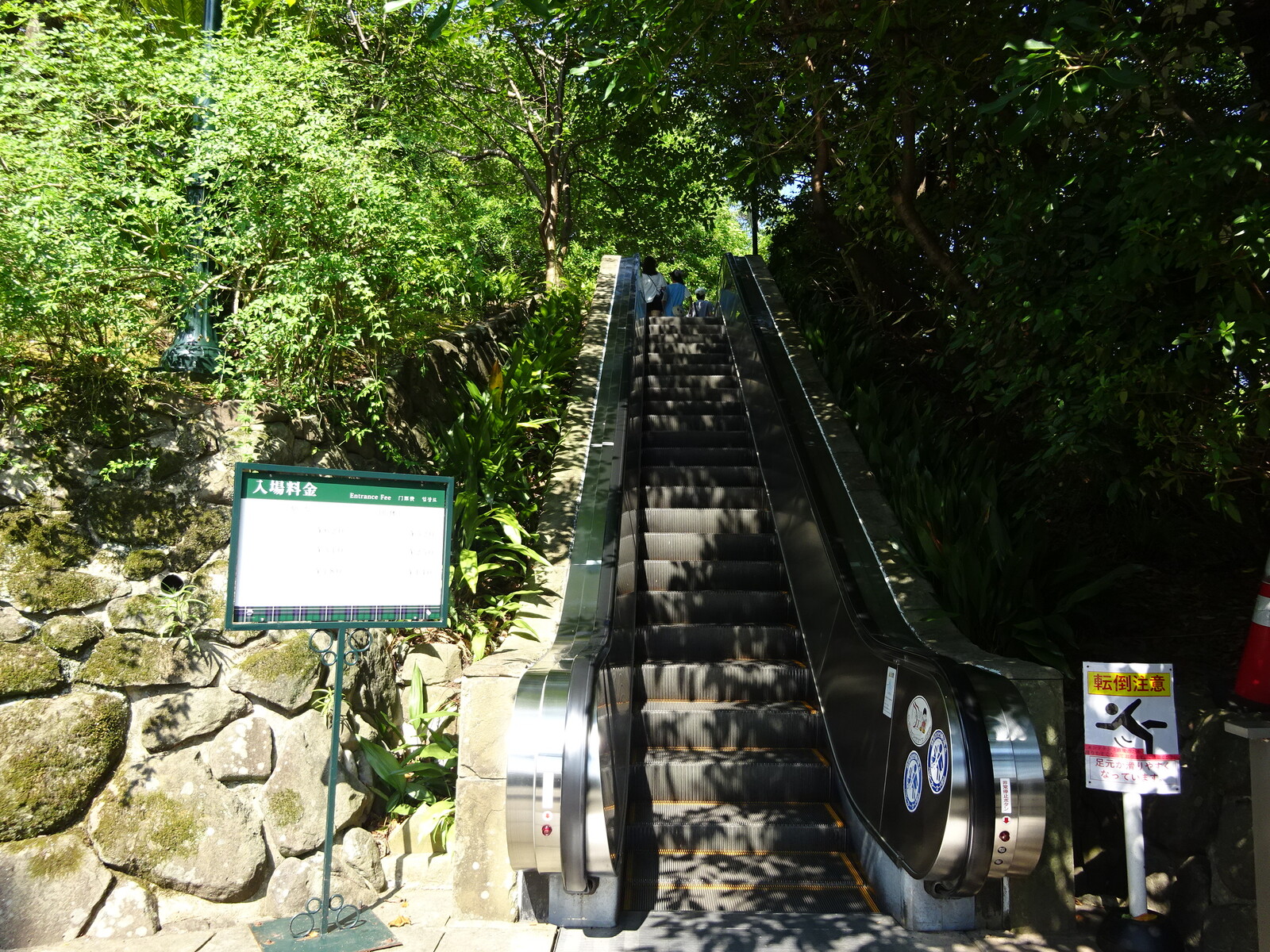 。このグラバー園は丘の上にあって、上に行けば見晴らしがいいんだけど、そこまで行くのが大変。だから、園内には、屋外エスカレーターが設置されていたよ。2台のエスカレーターを乗り継げば、ほぼ一番上までたどり着くことができるんだ。