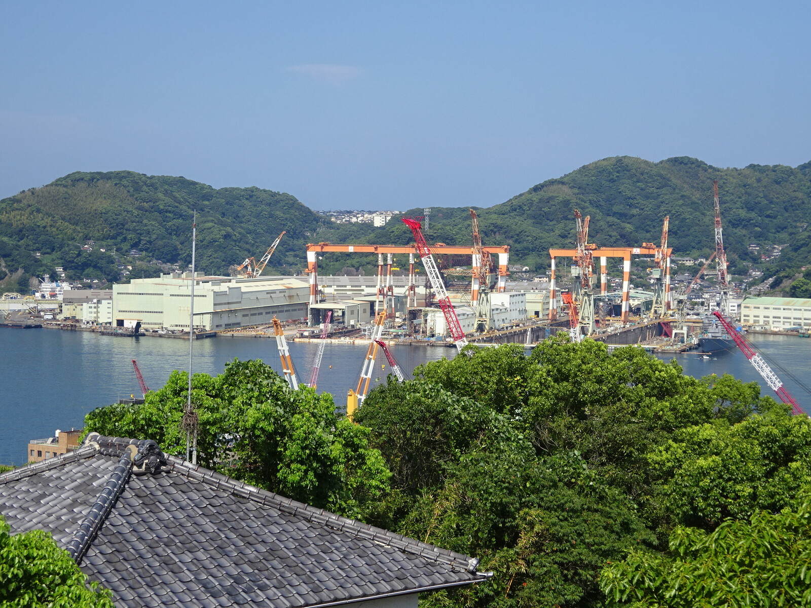 今の造船所は、当時とは違った場所に造られているみたい。護衛艦の停泊している一角があって、その奥辺りではないかと思ったんだけど、あってるかな?
