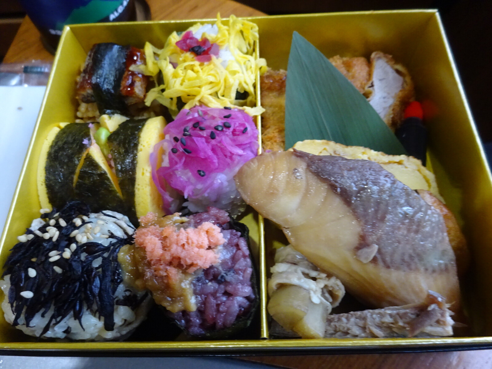中には、手まりおにぎりが6個と、黒豚とんかつ、カンパチの照焼き、さつま揚げなどなど、いずれも鹿児島産の食材を使った、カラフルな一品がずらりと並んでいたよ。