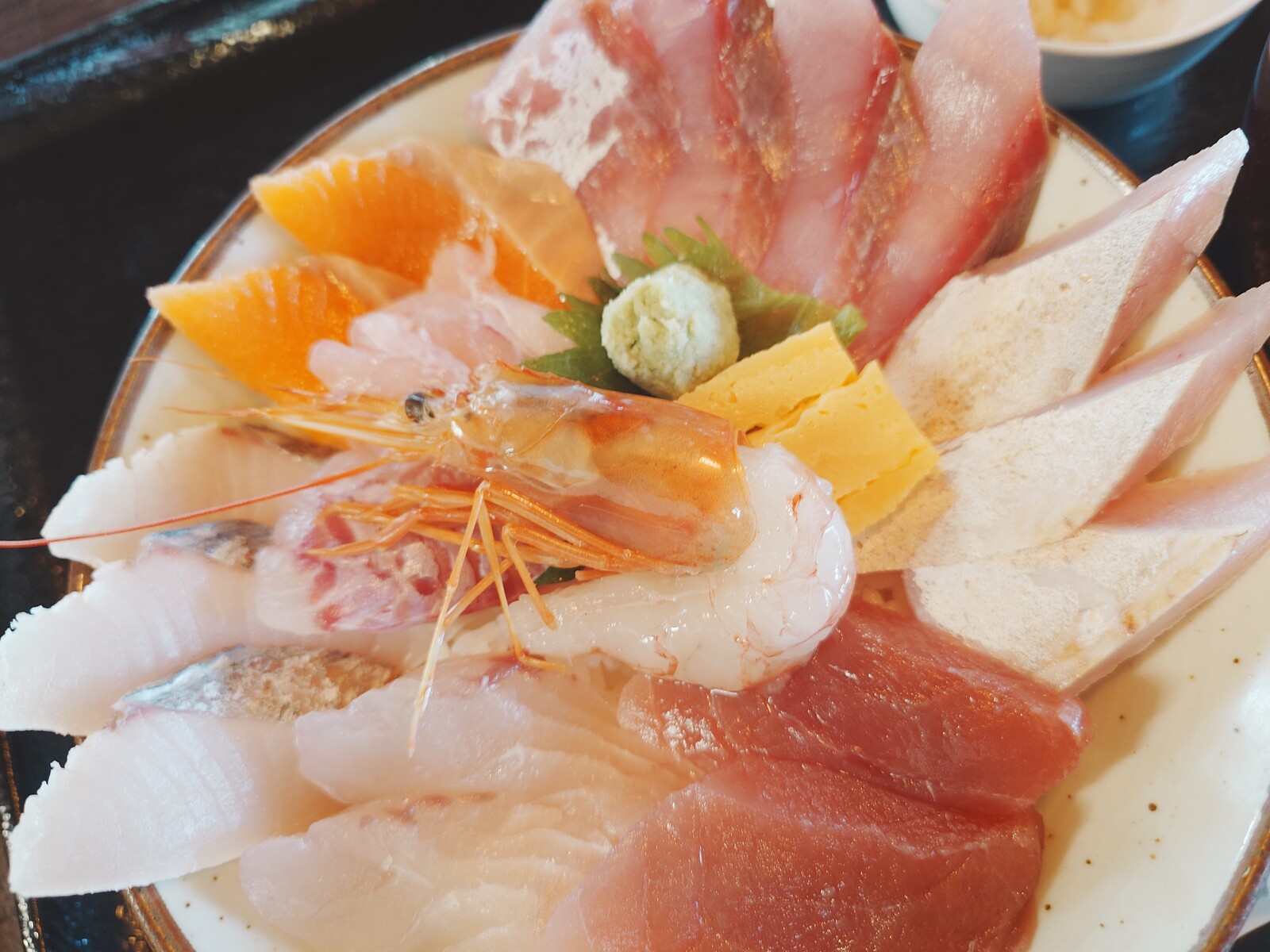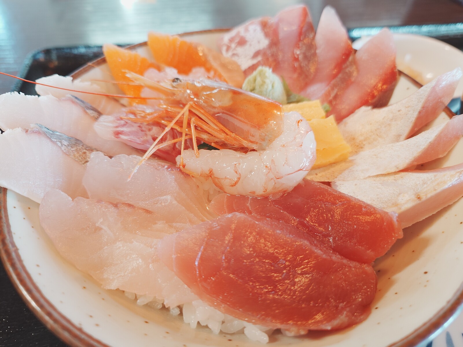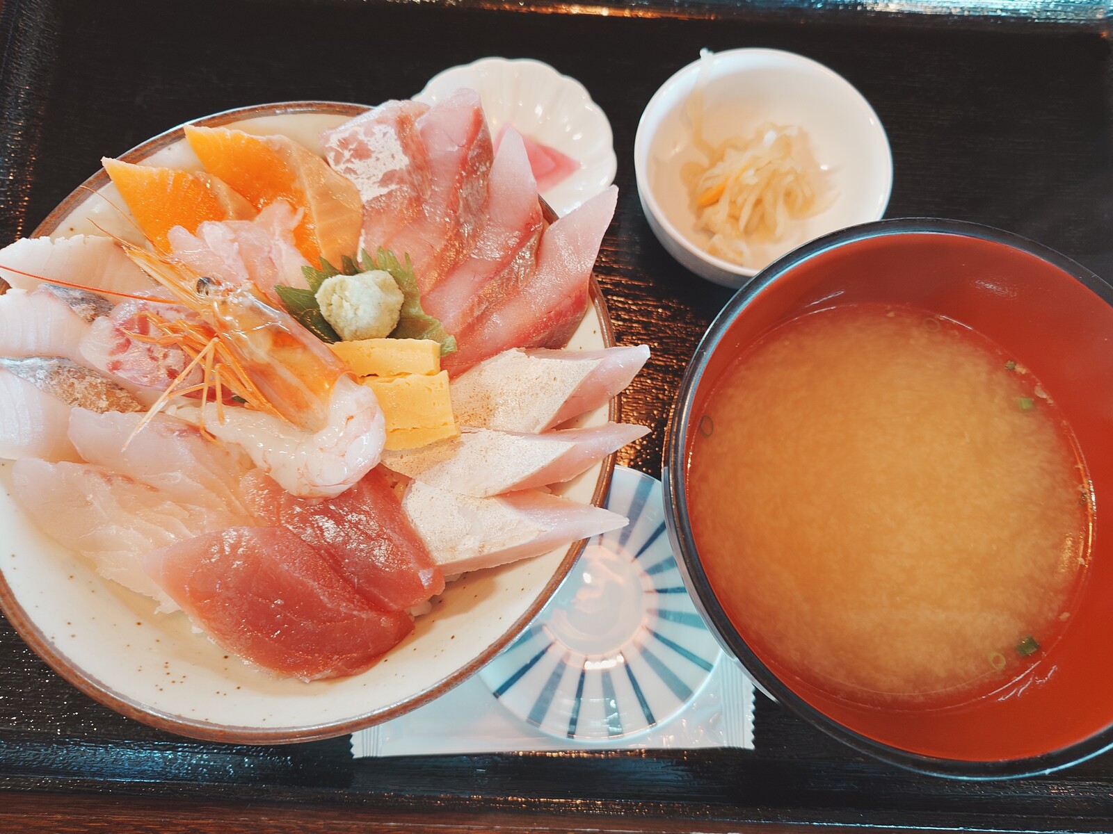 6種の魚が幾切れも入っていて、丼をおおいつくしていたな。この身の厚みは、どれも大型魚と思われ、それが惜しみもなく盛られてる丼は、圧巻だったよ。