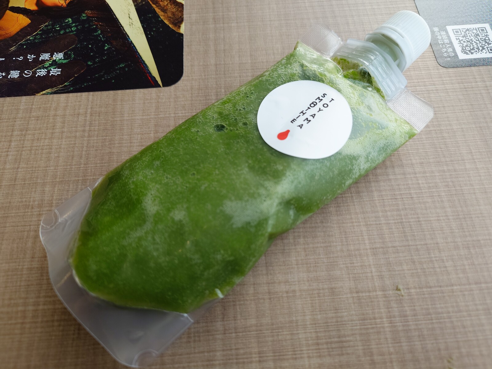 。かくして『富山の梨スムージー』を頼んでみたよ。カップではなく、パウチに入って登場。まだかなり凍っていたから、映画を見ながら少しずつとかしていただいたよ。